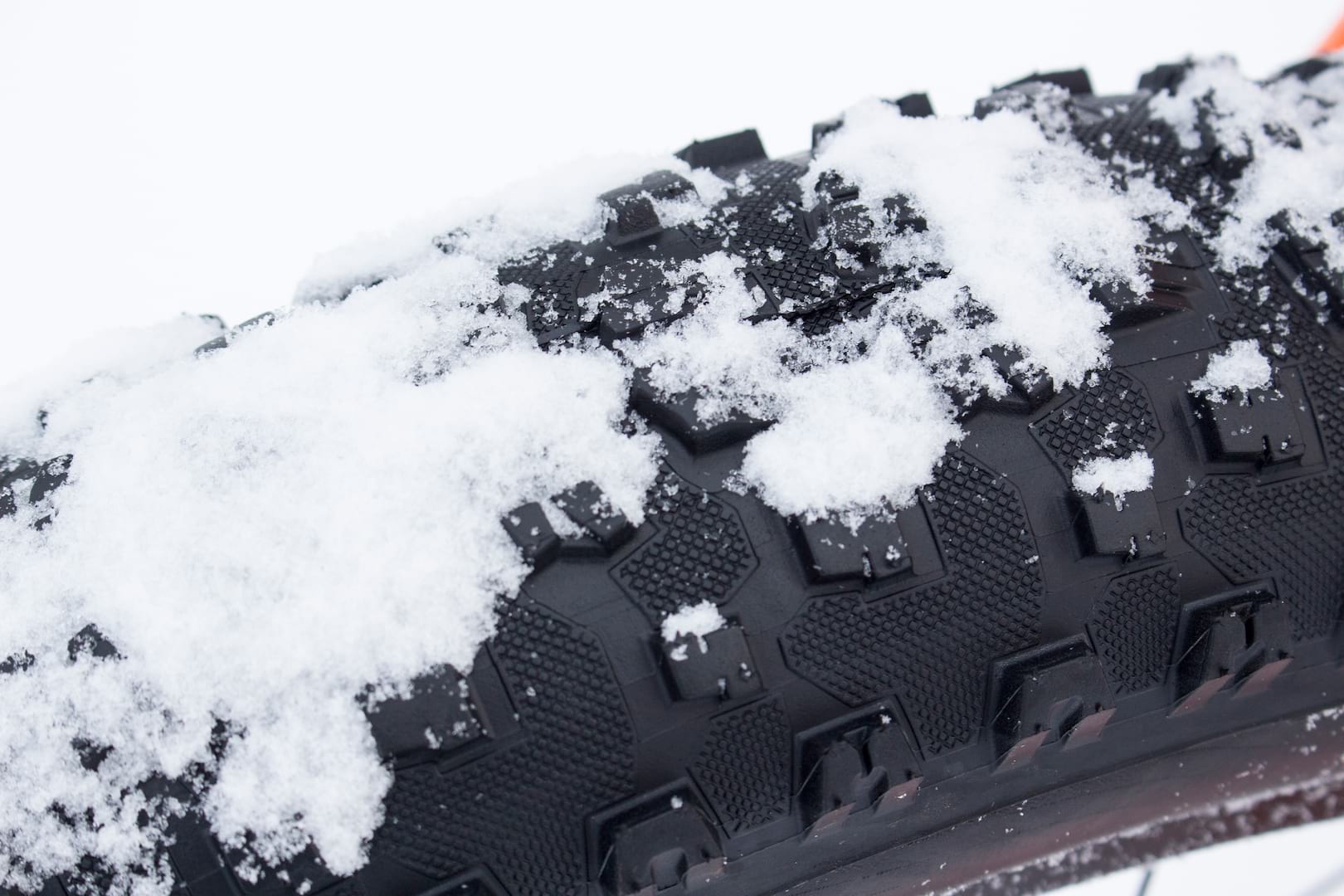 Snowmobiles have used the trail before us, and the snow is generally compacted enough to ride. It’s almost flat – with only slight changes in elevation along the way, barely enough to register on a contour map. Surrounded by conifers, we pedal. A slip and a wrestle, pedal again. You can’t completely switch off – it might be flat, but you need to pick your line, work out which bits have grip, which are firm, which are soft and will swallow your wheel like an axle-deep puddle back home. Pedal and pedal, barely touching the brakes. It’s not hard, and it’s not effortless. Mountain biking lite, or perhaps an exercise in mindfulness and just being.