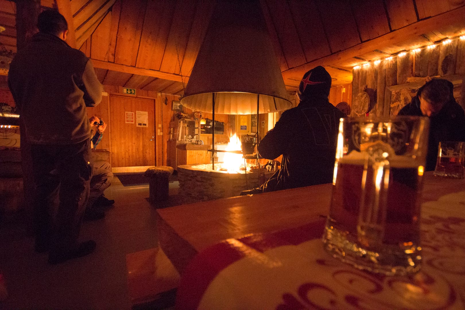 I am torn between the joyous novelty of sitting outside in snow while being warmed by the fire, and the dark cosiness of the wilderness hut itself. Candles lit inside, the table is laid for lunch, and the gently flickering flame draws me in.
