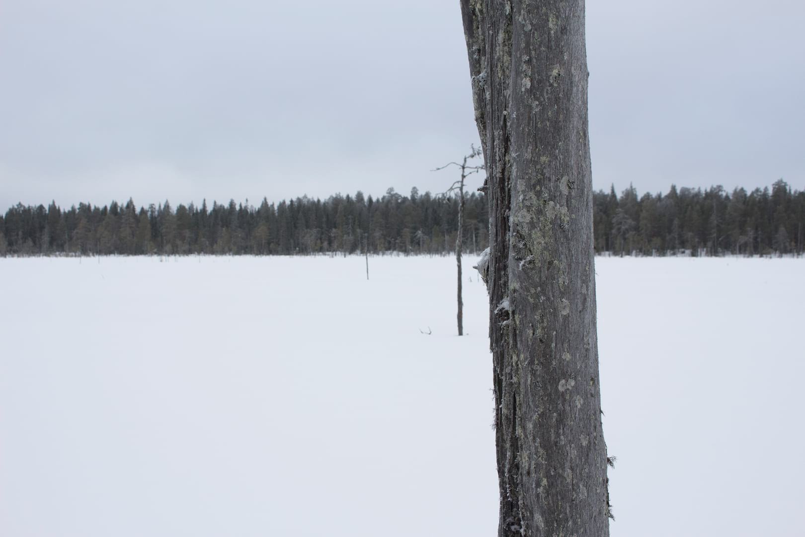 The trail leads us across vast frozen lakes and through trees dusted with snow. We’re told that there’s only about half as much snow as in some years, but there are still trees that have bent under their white burden, forming arches across our route. There’s a special word for the sound they make when they crack: tykky. In this world of silence, it seems worthwhile naming the few noises there are.
