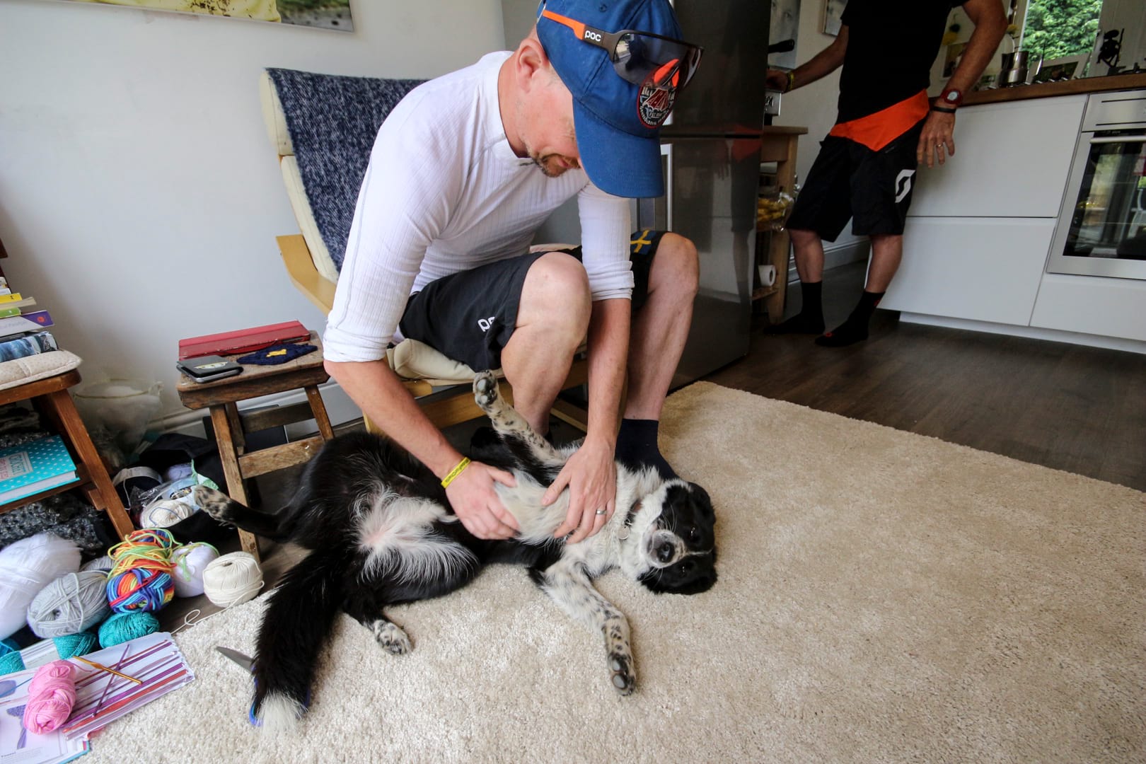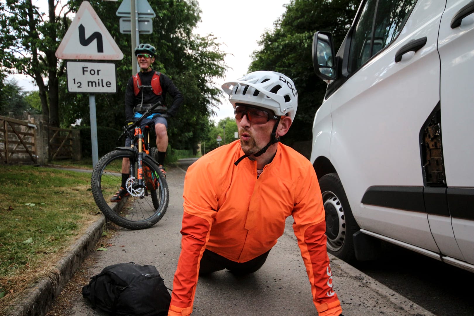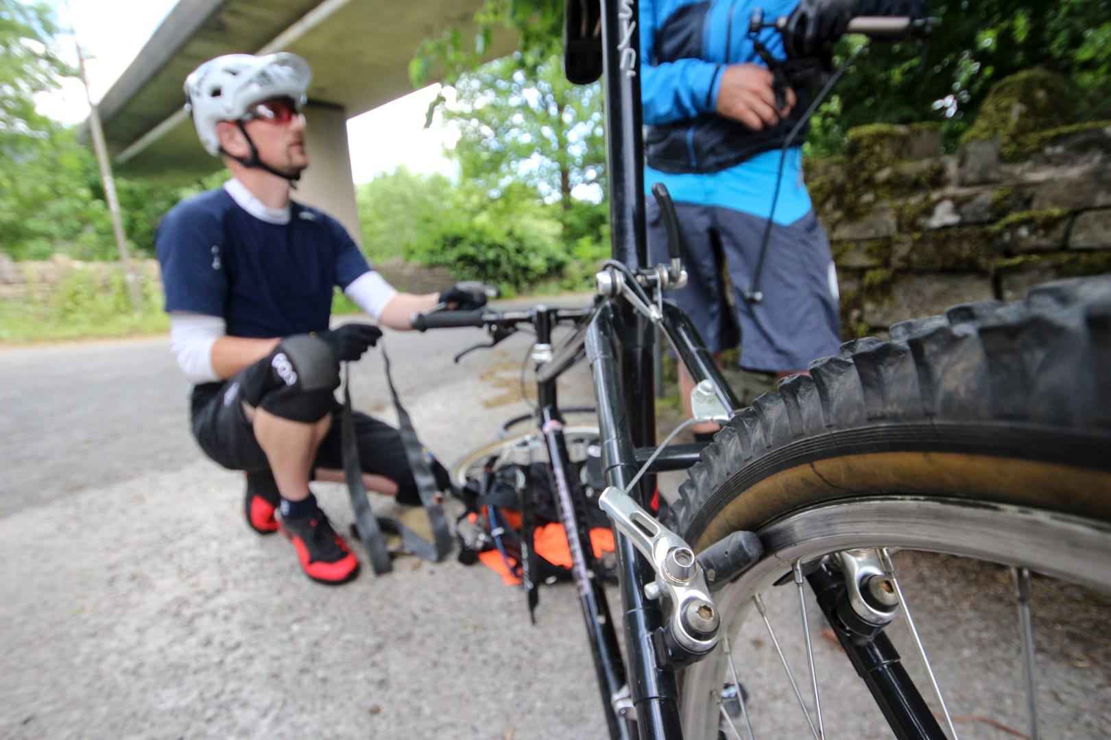 Undaunted, I encouraged them to get a wiggle on as I jauntily hopped on my bike and immediately wished that I had taken those yoga classes I had promised myself. Long and low are fine but being stretched out like you are on some medieval torturer’s rack, not so much. “Did I really ride like this?” I thought to myself while Nick and Mark were taking bets as to how far into the ride I would get. Spinning along the singletrack road in dappled sunshine, I was feeling good. Stretched but good. It took all of 50 metres for my front tyre to make a telltale ‘pfft pfft pfft’ sound. A bloody puncture! Perhaps I should have heeded Matt’s advice after all? Throwing me his pump, Nick kindly offered to help me fix my next puncture. Could it be that he expected more? Oh he of little faith.