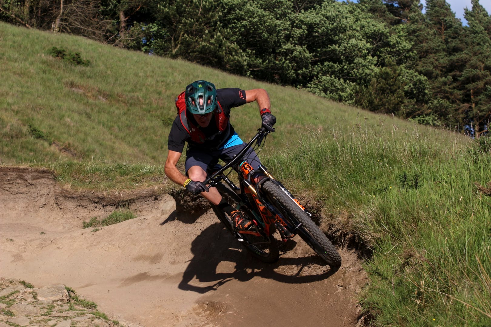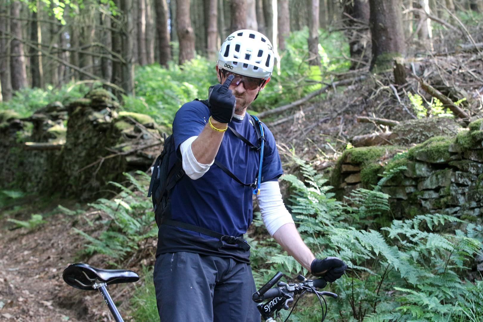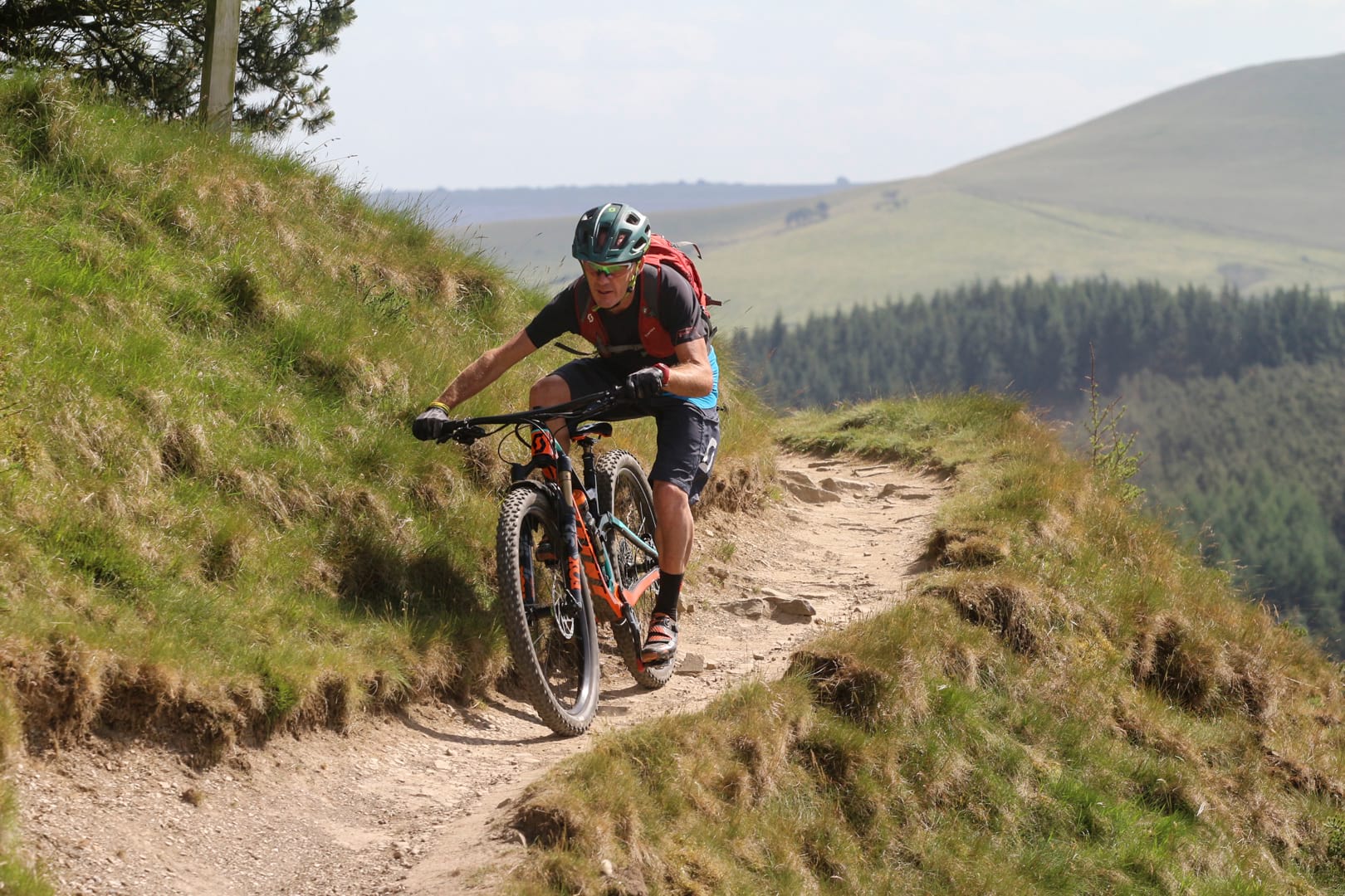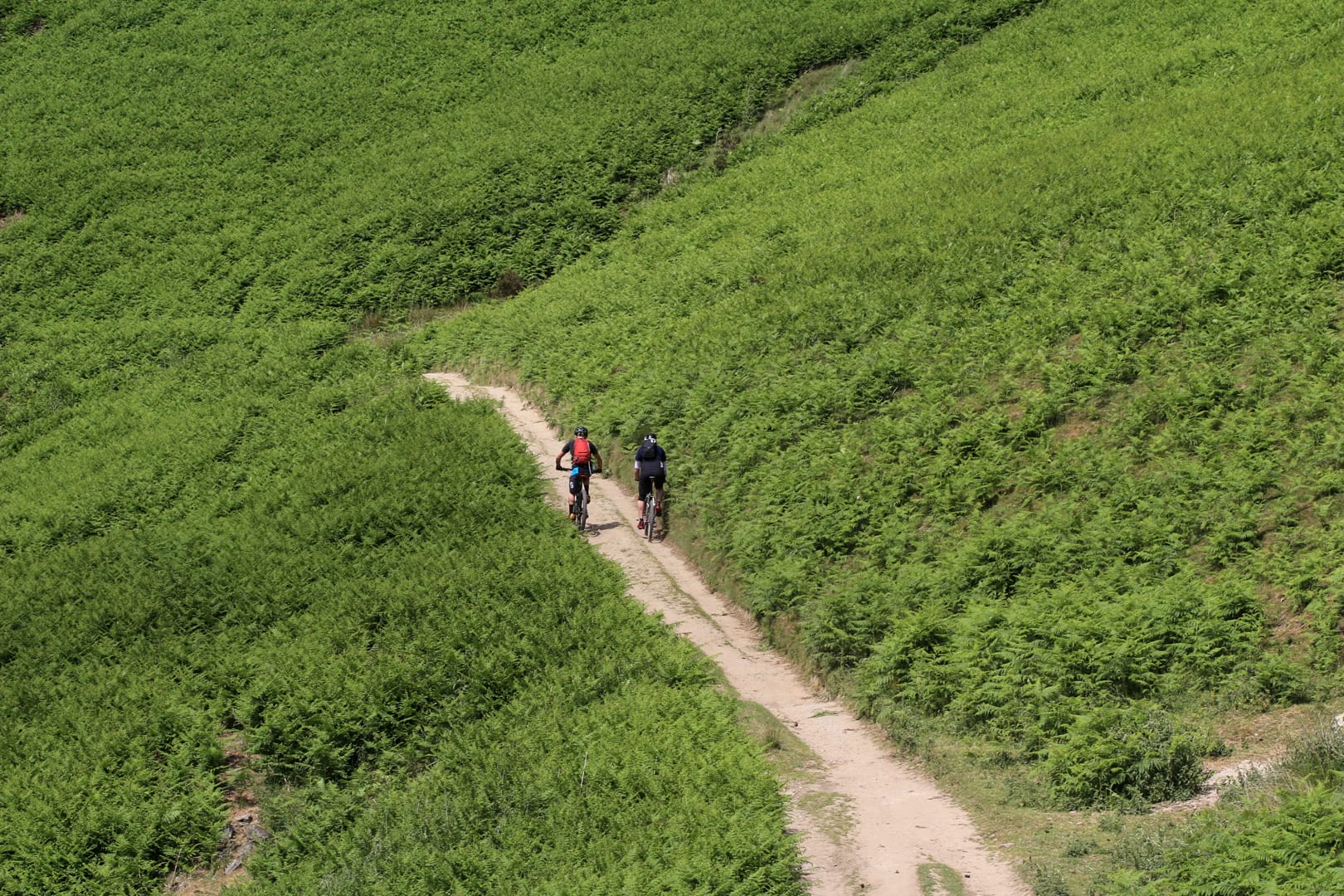 Leaving him far behind, a long road section beckoned. On modern bikes, it is easy to become bored with such interludes. All they do is help join the dots, but for me, my back and neck now less than happy, the gentle spin came as a blessed relief. I could finally enjoy the feeling of the warm sun on my face and take in the classic view of where the Dambusters prepared for their attack on the Ruhr Dam. Reaching the northerly tip of our ride, Tim’s literary voice directed us up the tree-canopied climb to Lockerbrook Farm. Looking at the trail rear up in front of me, I didn’t fancy my chances of a clean ascent, but through a bit of man grunting and extended use of my bar ends, I was determined not be beaten. With Nick shouting encouragement, clean it I did. Take that, e-bikes and 160mm 29ers! I won’t say it wasn’t a struggle but damn, it felt good when I reached the top.