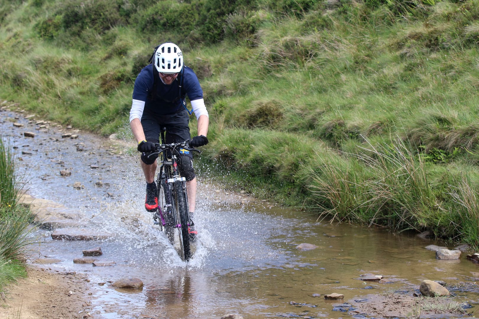 Cresting the summit plateau, I found somewhere the bike actually worked quite well – sand. As Mark discovered that e-bikes on turbo mode and sand can be a recipe for doom, my unconventional bike and riding position made for surprisingly easy progress. Who knew that a Graeme Obree-esque Superman style could work so effectively? Moreover, who knew that the eternal slop of Peak District mud was actually sand when the trails dried out? That will be what the driest spring on record teaches us. Stopping to consult the guidebook, the descent of Blackley Clough beckoned us ever on. “Sanny, you go first,” Mark called as I engaged my period dropper post device (a quick release lever) and rode what must look on camera like the world’s crappest stream crossing. Tim Woodcock describes the ensuing descent as “steep and rutted!”. His use of the exclamation mark filled me with a little apprehension. Just how tough could it be? As Nick and Mark joined me, I felt like a gladiator at the Colosseum. Except I wasn’t Spartacus. I was the guy who was destined to be lion food.