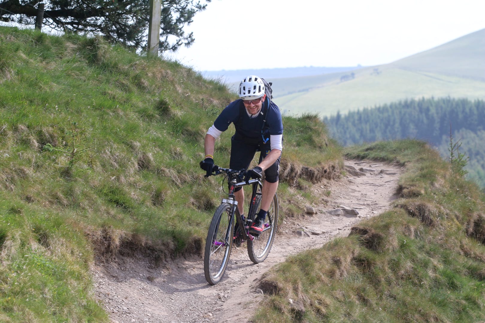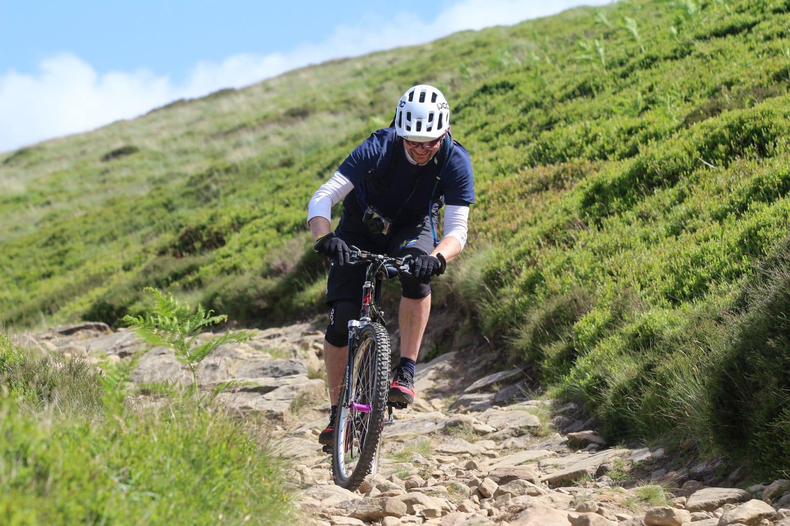 “Once more into the breach!” I shouted as I engaged hyperdrive. Within seconds, I was regretting my initial burst of speed. My pace slowed dramatically as I pinged from rock to rock, each loose babyhead being a wheel-trapper hiding in plain sight, ready to send me into oblivion. I was out of control and I swore for Scotland. “F##k!Sh#t!Ar#e!” Looking up was challenging to say the least as the much lauded at the time “direct steering to keep you feeling connected to the trail” made for a bit of a horror show. My tyres seemed to positively shrink in front of me. It was, to be frank, brutal. However, the further I got without impaling myself on the unforgiving gritstone, the more my confidence grew. I may have looked like a giraffe on roller skates, but I was still riding and still smiling. Finally reaching the safety of the tarmac road far below, I breathed a sigh of relief. I had made it! Turning around, my new-found hero status was tarnished somewhat as Nick and Mark practically floated down the trail far faster than I had managed. The bastards!
