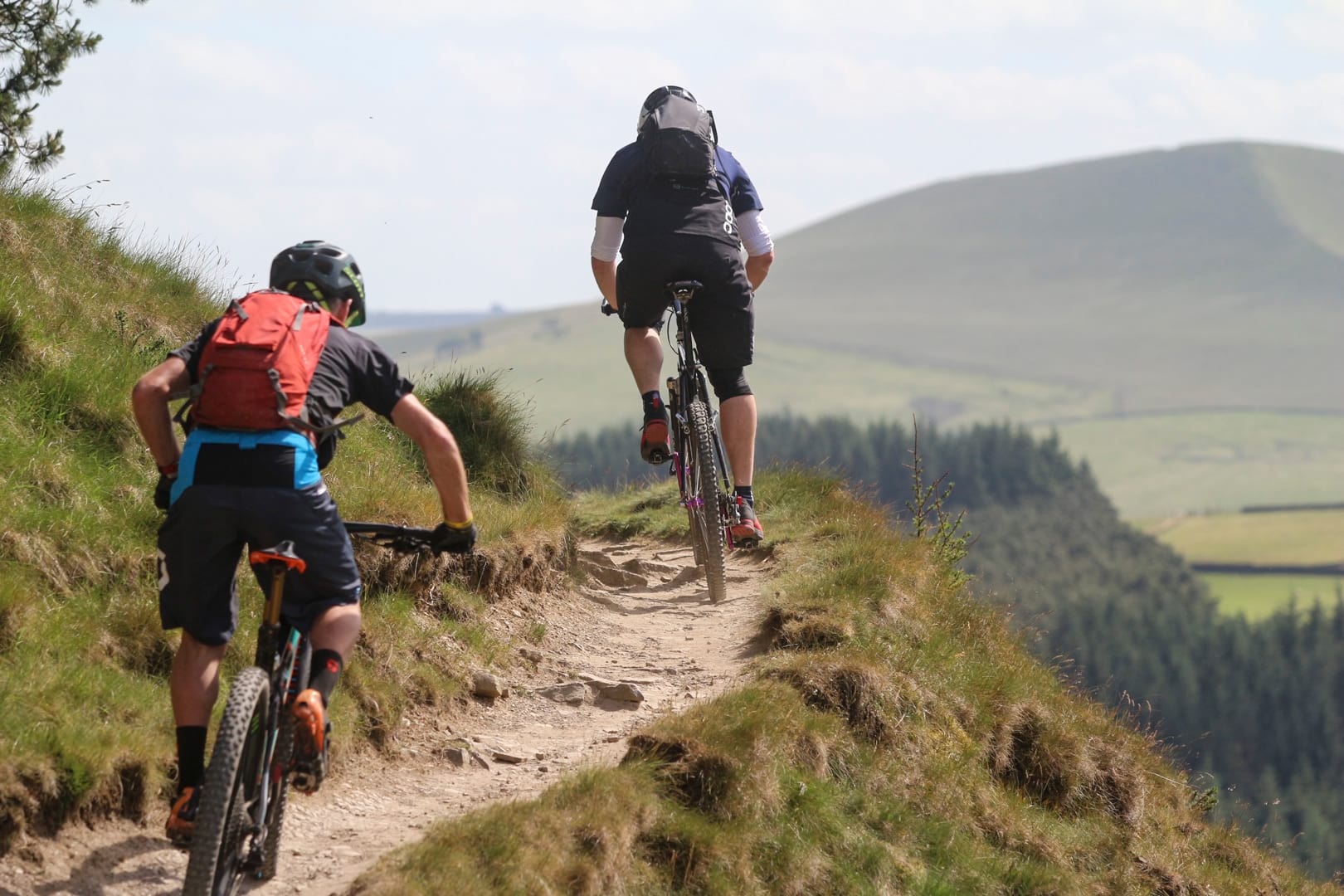 Wheel back on, the ride resumed. We were headed up the old Roman Road that would take us to Hope Cross. Dropping it into my not so low gear of 24:26, I did my best to spin up the loose and dusty climb. Nick on his fancy plus size 29er and Mark on his pun-tastic, app-controllable (yes, you read that right, a bike that you can control using your phone – my teenage brain would have been fried at the very thought!) Specialized Evo Kenevo e-MTB, unquestionably the antithesis of my machine, practically wafted up the trail while every pedal stroke for me became a battle of traction and control.