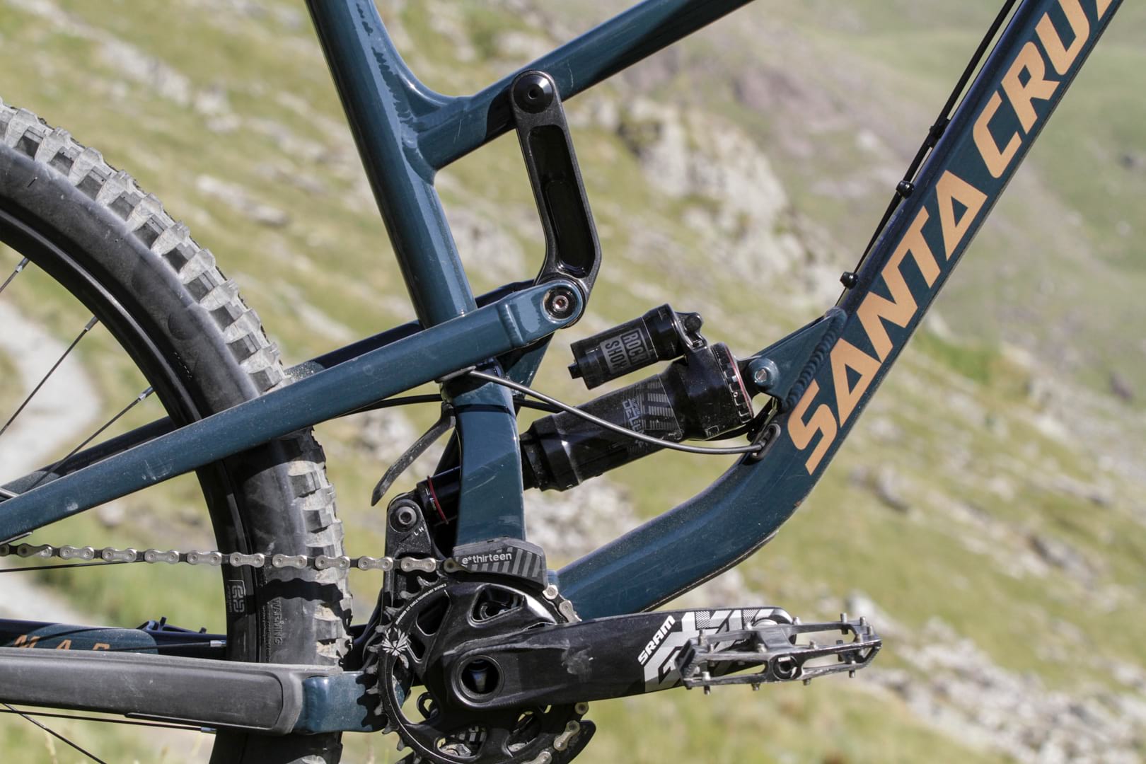 The build is bombproof and built to last, even when riding downhill tracks in the bike park. The now standard Santa Cruz lifetime frame and bearing warranty backs up the package further. Interestingly the bike weighed in at a smidge over 31lbs. But it didn’t feel overly weighty; the frame and wheels felt stiff and this offered a degree of pop and playfulness that was missing from other bikes on test. This is no sloth on the trails; it flounces a decent level of agility and didn’t feel too cumbersome especially when pointed downhill. It possesses a turn of speed and a beautiful feel when on the limit of grip. It is a bike that renders the phrase ‘if only I had a bigger bike I’d have given that line a go’ null and void.