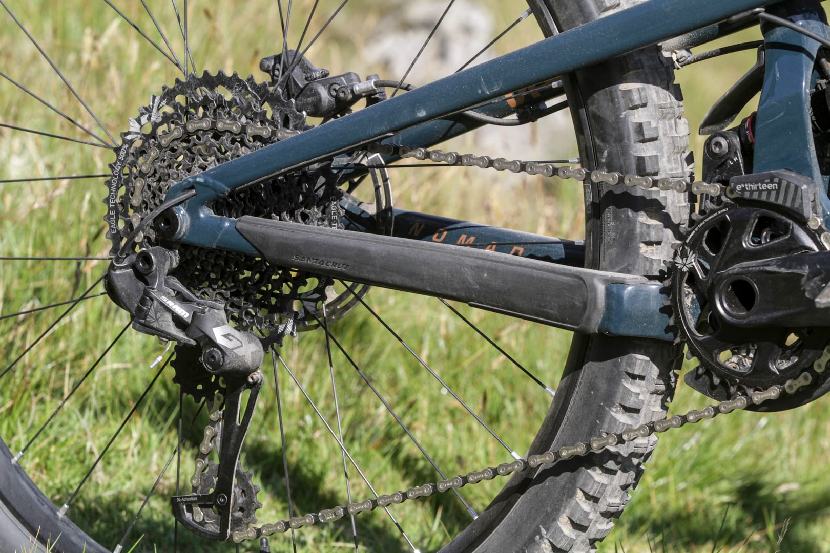 The lack of any shock lockout on the RockShox Super Deluxe R really denotes the bike’s intentions. Despite that, the bike climbs better than you would believe, proving that it’s more than a mini DH bike. I put this down to the VPP suspension design, the seat tube angle and the faultless 12-speed SRAM Eagle GX dinner plate-sized cassette. There is no mistaking the Nomad is not a cross-country or trail bike, but there is an element of pedal efficiency like a diesel plodder rather than a sports car when the seat is up and you find the terrain heads skywards.
