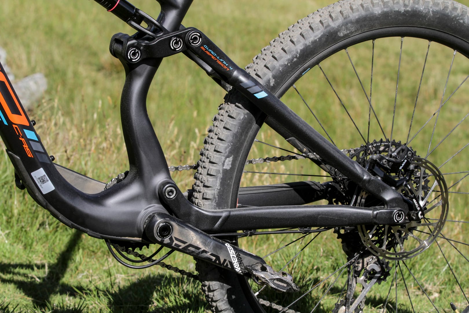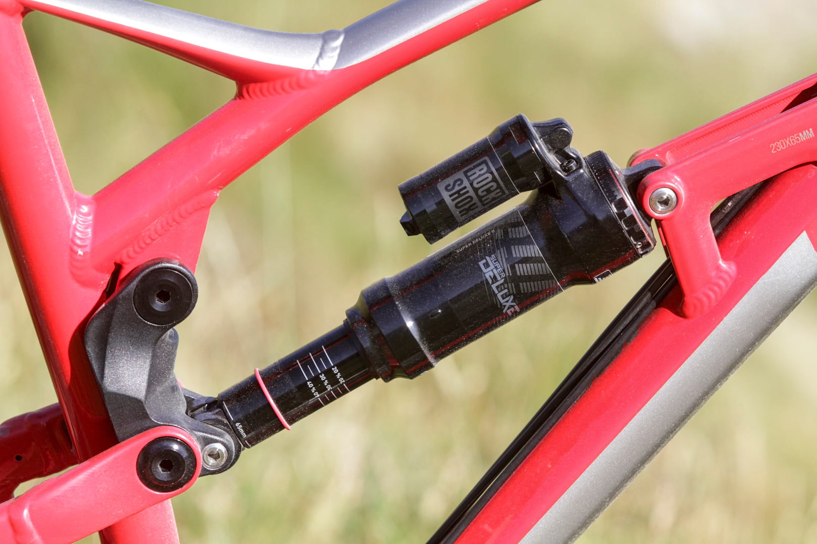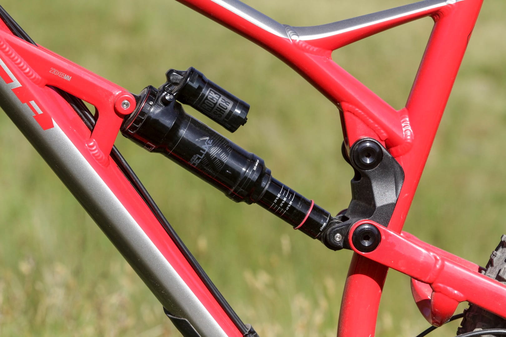 Up front, the carbon main frame houses the shock neatly tucked up underneath the top tube to allow access to the controls. This also grants the choice of a big piggyback shock upgrade later and allows room for a bottle cage and ample space for a full-size bottle.