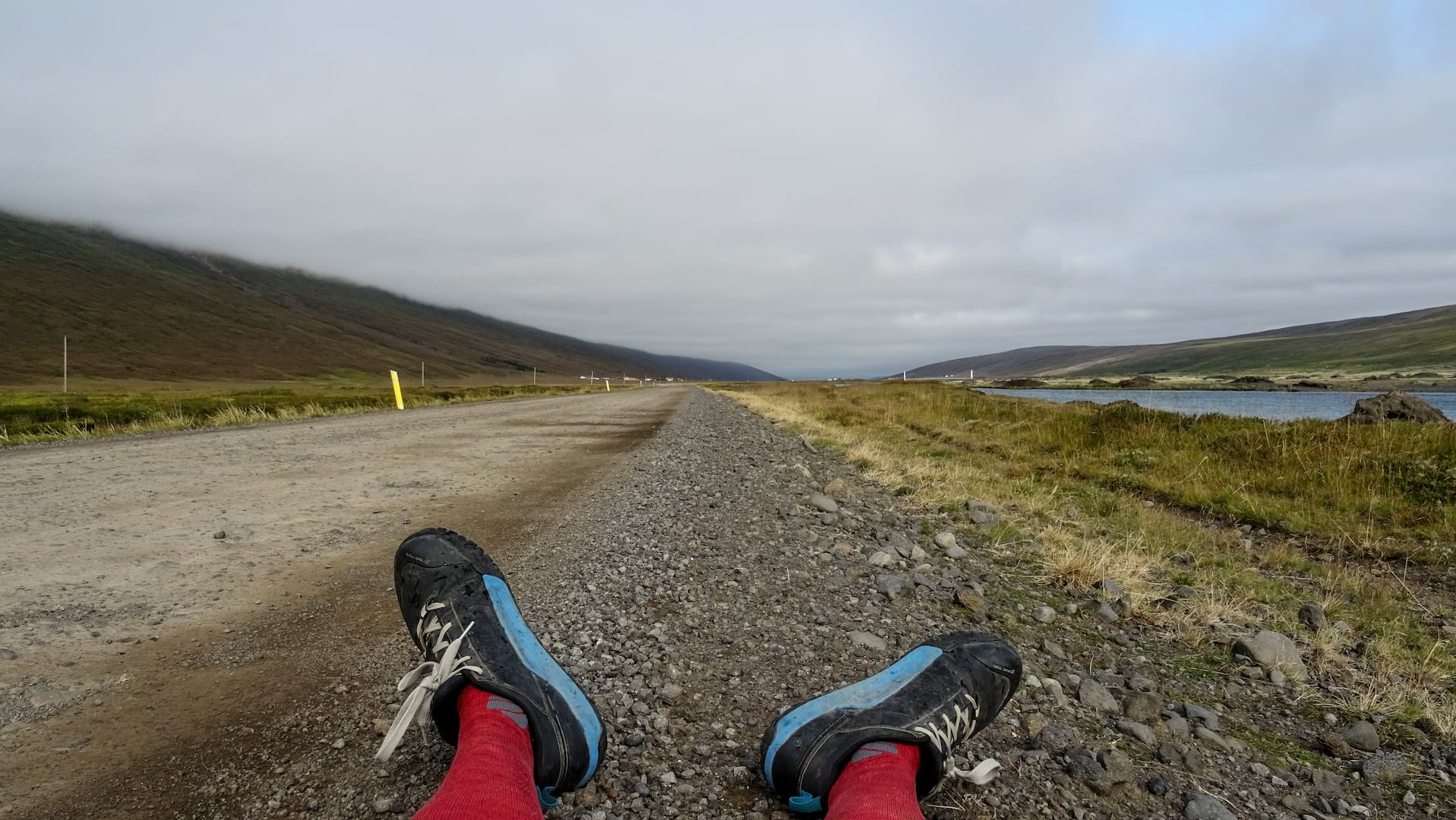 On reaching the tarmac of Route 1, I crouched to hug its joyous, solid, smooth firmness, delirious with the knowledge the washboard was over. Less than a kilometre down the road I pulled into the Godafoss waterfall viewing area. Finding nowhere to sit, I collapsed on the floor next to my bike. I had no idea how dirty, dusty, and exhausted I looked, but a minute later an American woman approached me with a bag of grapes and an apple. I had no words at all; I stared dumbfounded as she handed me fresh fruit. My dehydrated meals on this trip were incredible, the best I’ve ever had, but fresh fruit was something else. Between stuffing grapes into my mouth, I thanked her over and over, slowly regaining the energy to recount some of my journey to her. Overhearing this, an Italian couple thrust a peanut butter sandwich into my hand. These people will never have any idea how incredible their simple generosity felt to me.