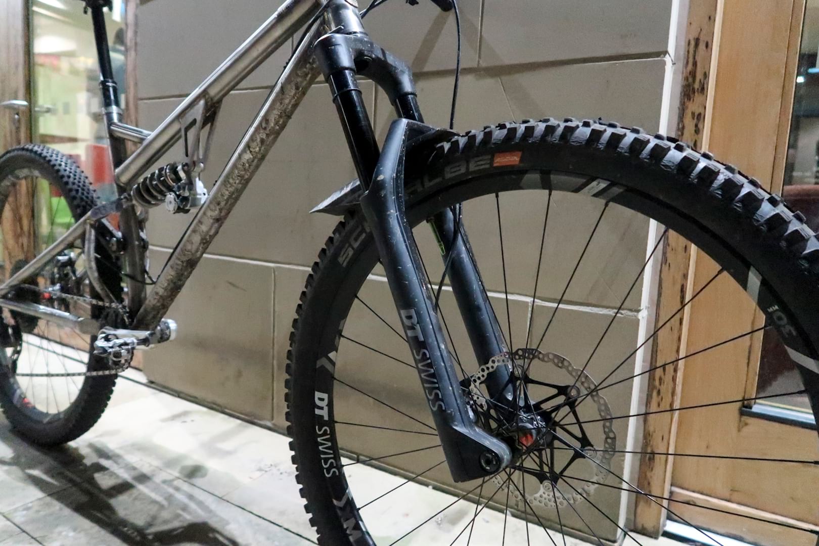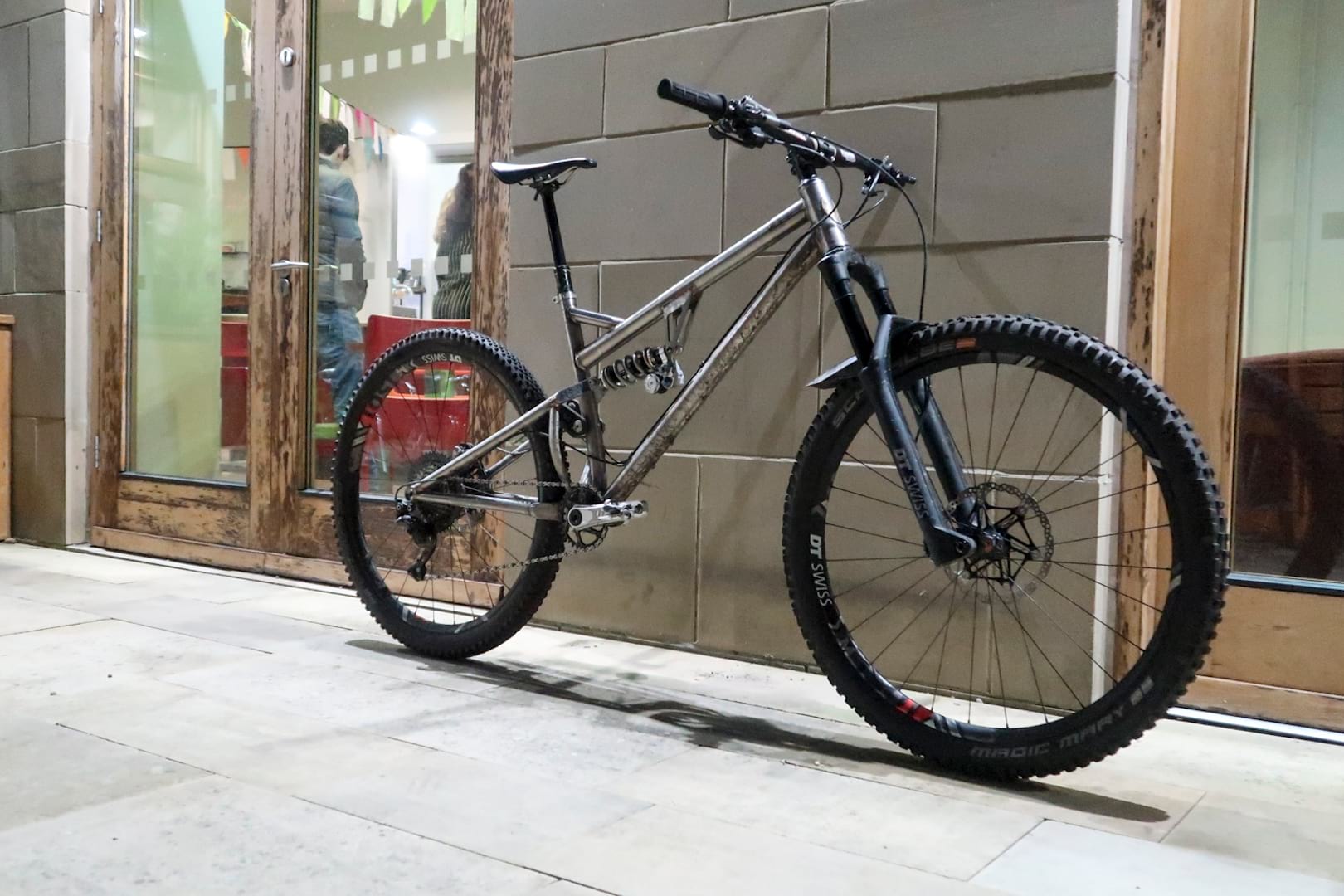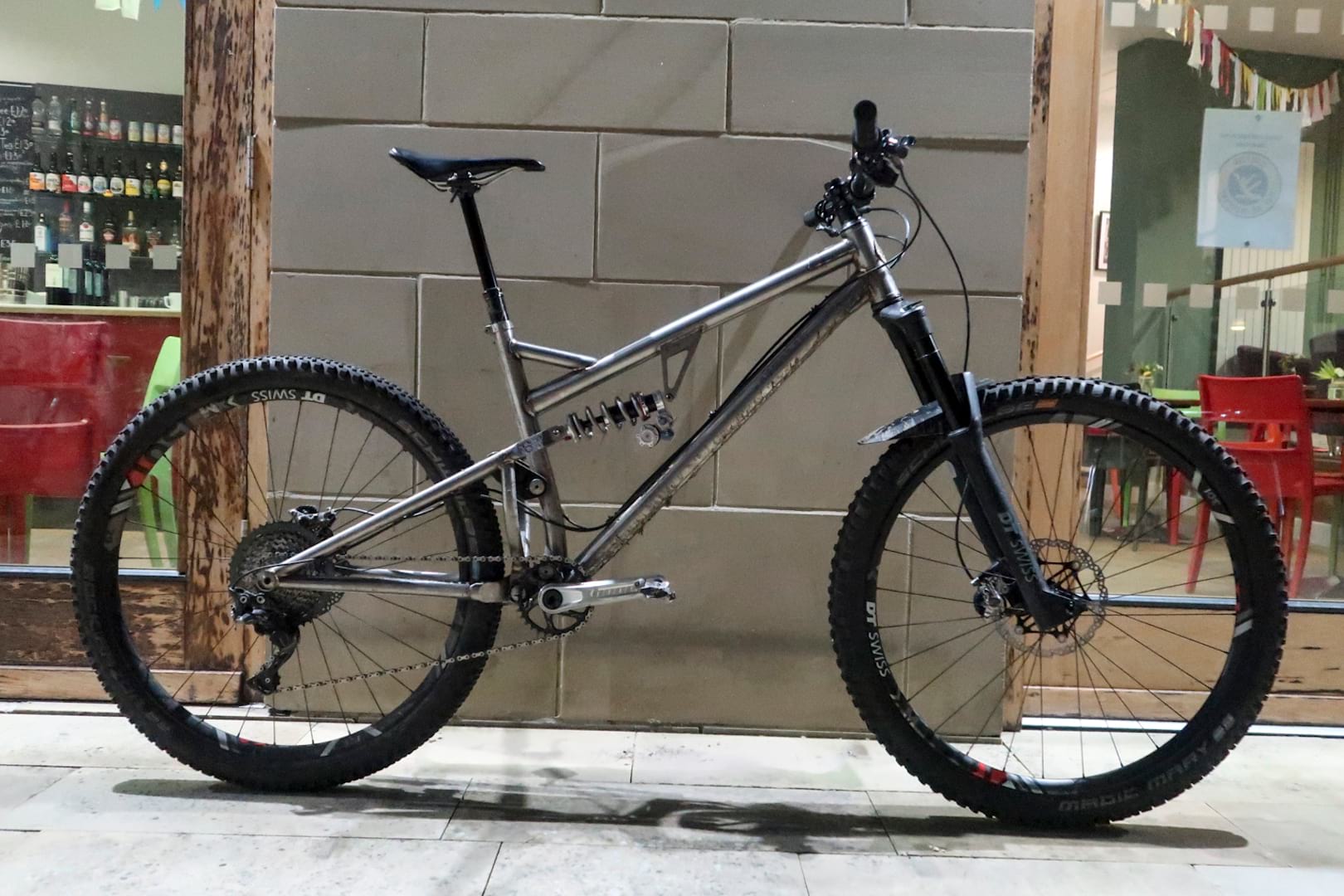 It’s a Kingdom Vendetta XFS 29, with 136mm-and-a-bit rear travel, 150mm at the front. Kingdom is a Danish company, run by two nice English ex patriot fellas named Chris and Adam. They started out with sexy hardcore TI hardtails in 2007/8 and have gone on to make a range of really luxurious TI hardtails, CX bikes and a couple of full bangers. The X versions of their bikes are manufactured a little more economically (CNC’d parts are left out and tube profiles are simpler) to make gorgeous Ti bikes more attainable for people like us. This is one of the first 29” versions of their Vendetta XFS and I love it.