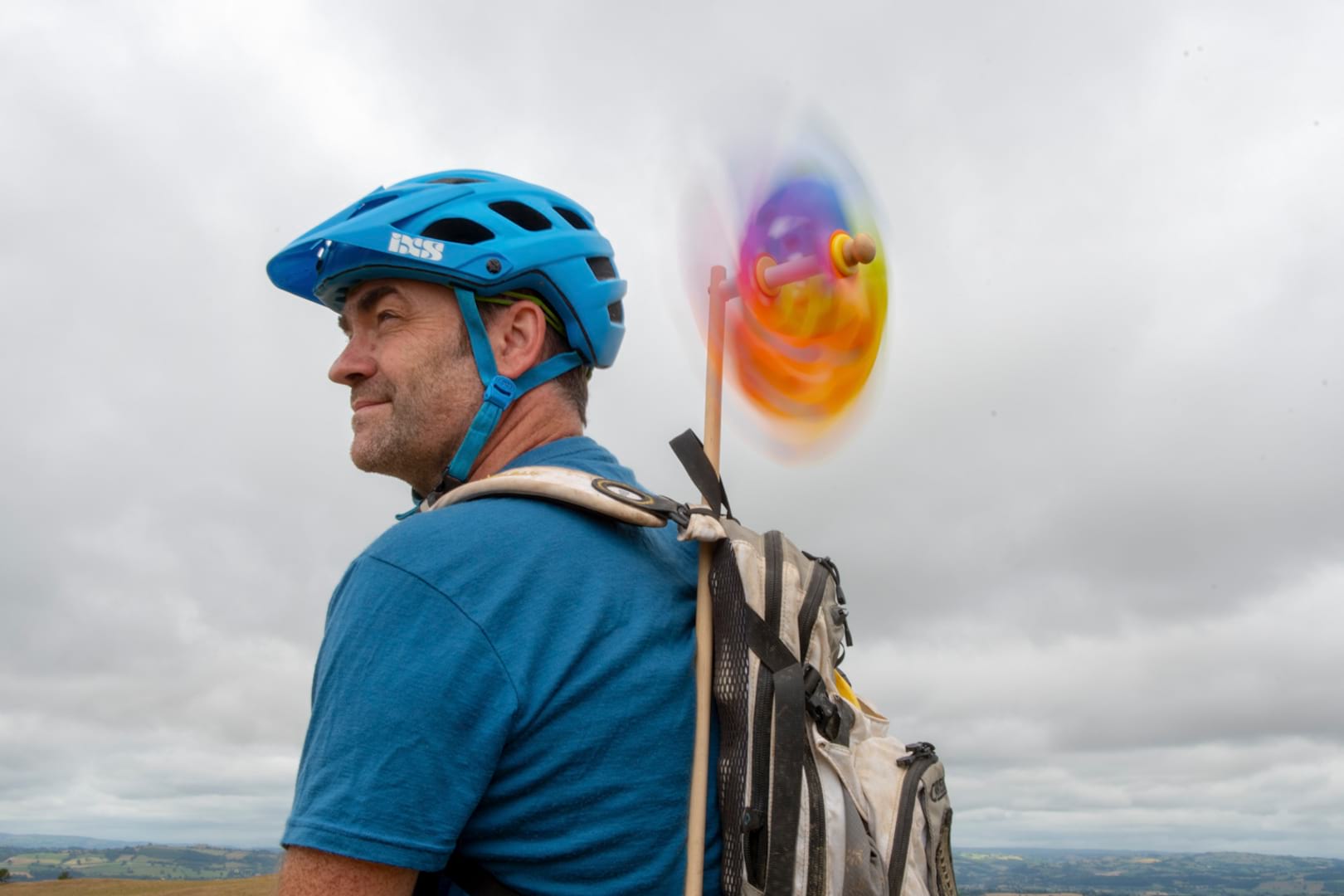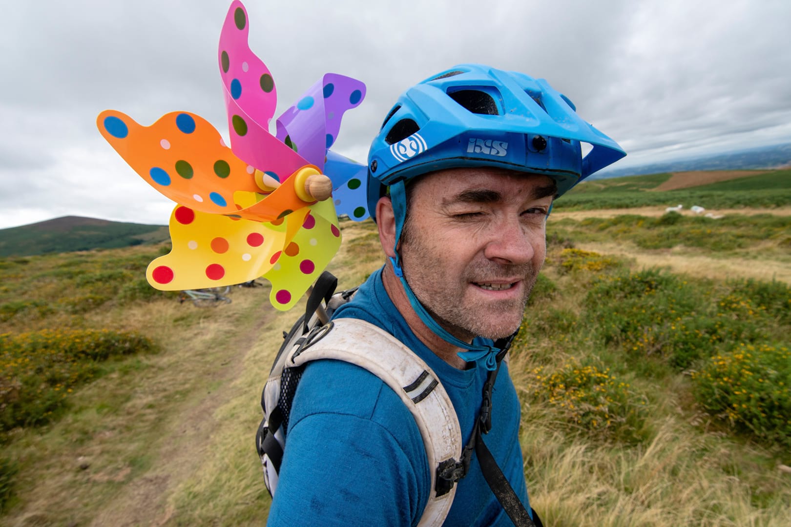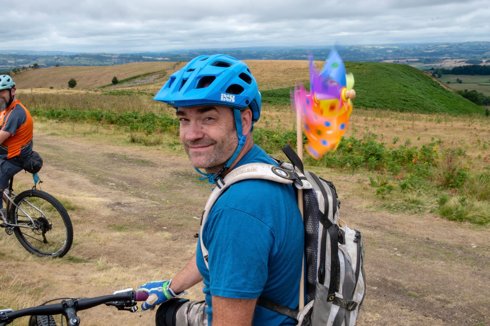 I picked a couple of trusty fellows to assist me in my Zen-like quest. Firstly my mate Jim Burley – the Top Gun of bike mechanics. Jim is a long-time denizen of Shropshire so he could act as guide, folklorist and interpreter – happily, he speaks the language. And Dave Astley – ace bike mechanic at Oneplanet Adventure in Llandegla, Ti Stooge rider and (honestly, this was the clincher) owner of a magnificently druid-esque beard. Jim decided to spend the majority of the ride with a ley line detector in his backpack. This turned out to be a rainbow-coloured wind-wheel. It certainly lent proceedings a colourful tone…