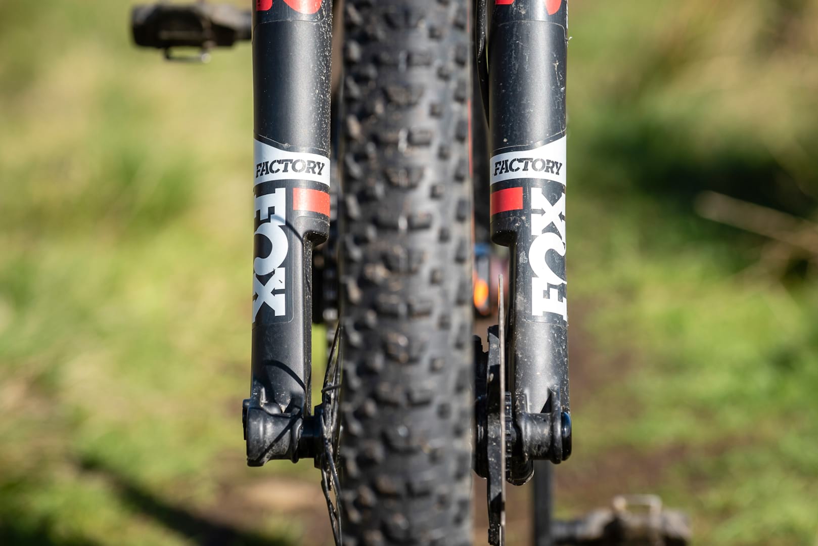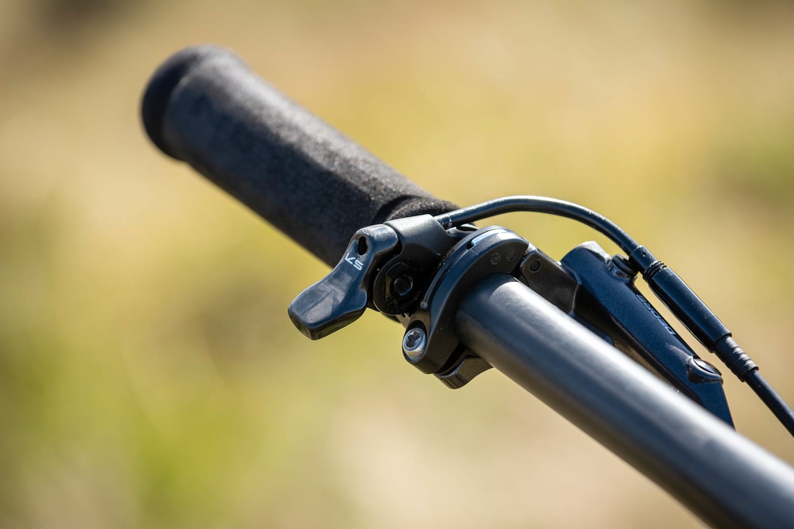 The popular Fabric Line Elite saddle sits atop a KS Carbon 125mm dropper post, complete with carbon thumb lever at the bar. The push-down action wasn’t popular with riders more used to under-bar levers, and the post’s movement could have been snappier in keeping with the bike’s purpose, but it was predictable and reliable, so we’ll take that.