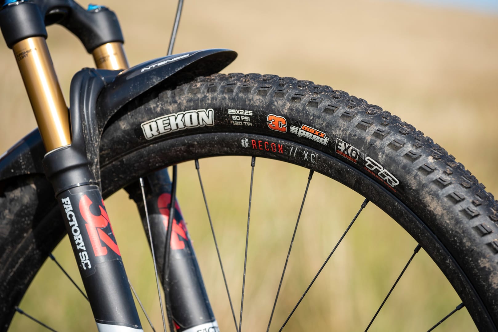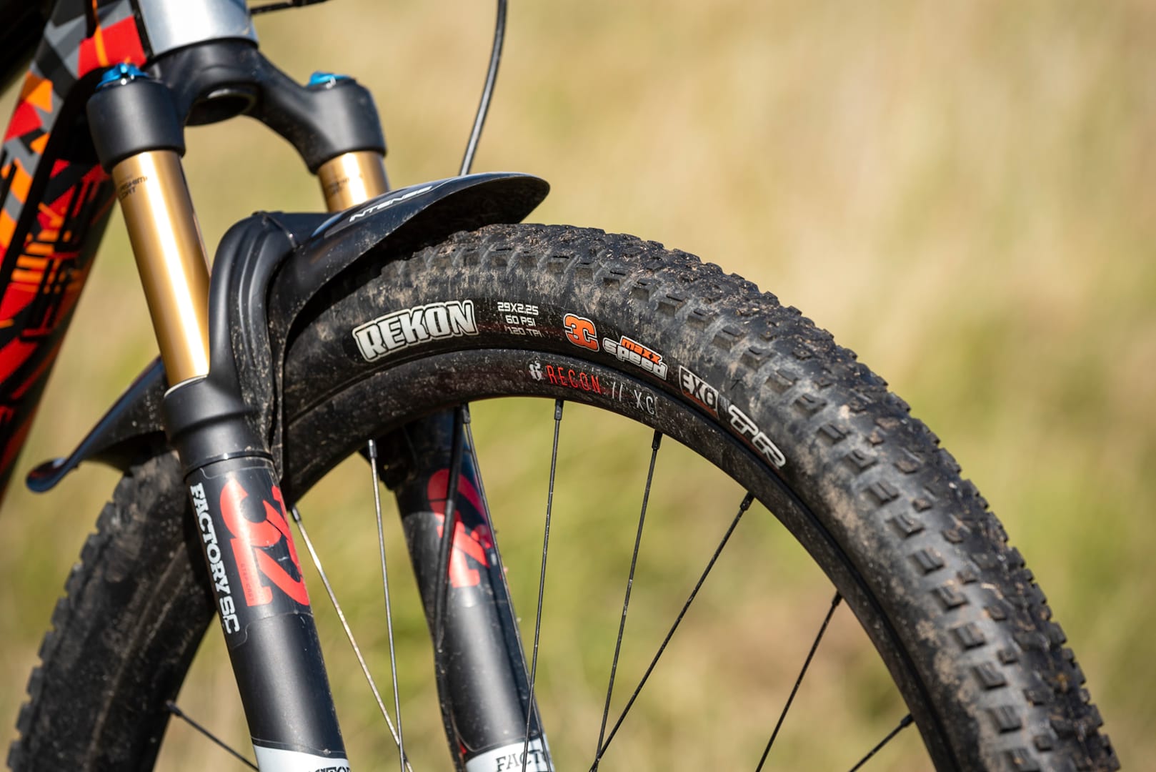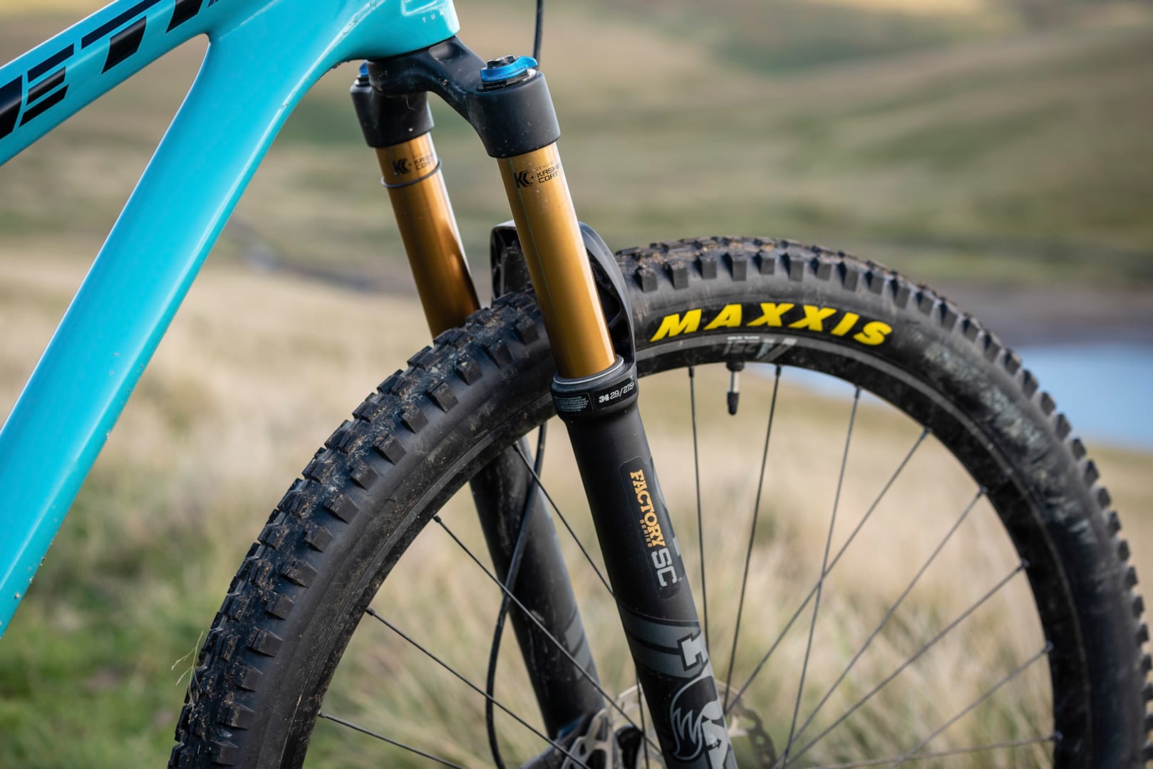 So far, so lightweight cross-country racer, but moving to the wheels and we see a pair of DT Swiss M1700 wheels with a decent 25mm internal width – not your normal cross-country race wheel. And it gets even less racy when you look at the tyres. The Maxxis Minion DHF 2.3 up front and an Aggressor 2.3 out back telegraph this bike’s intentions as a bike with scope way bigger than the cross-country race course. Given the swoopy shapes and top flight components, the chunky tyres come as a bit of a shock, but they soon look like they belong on this bike.