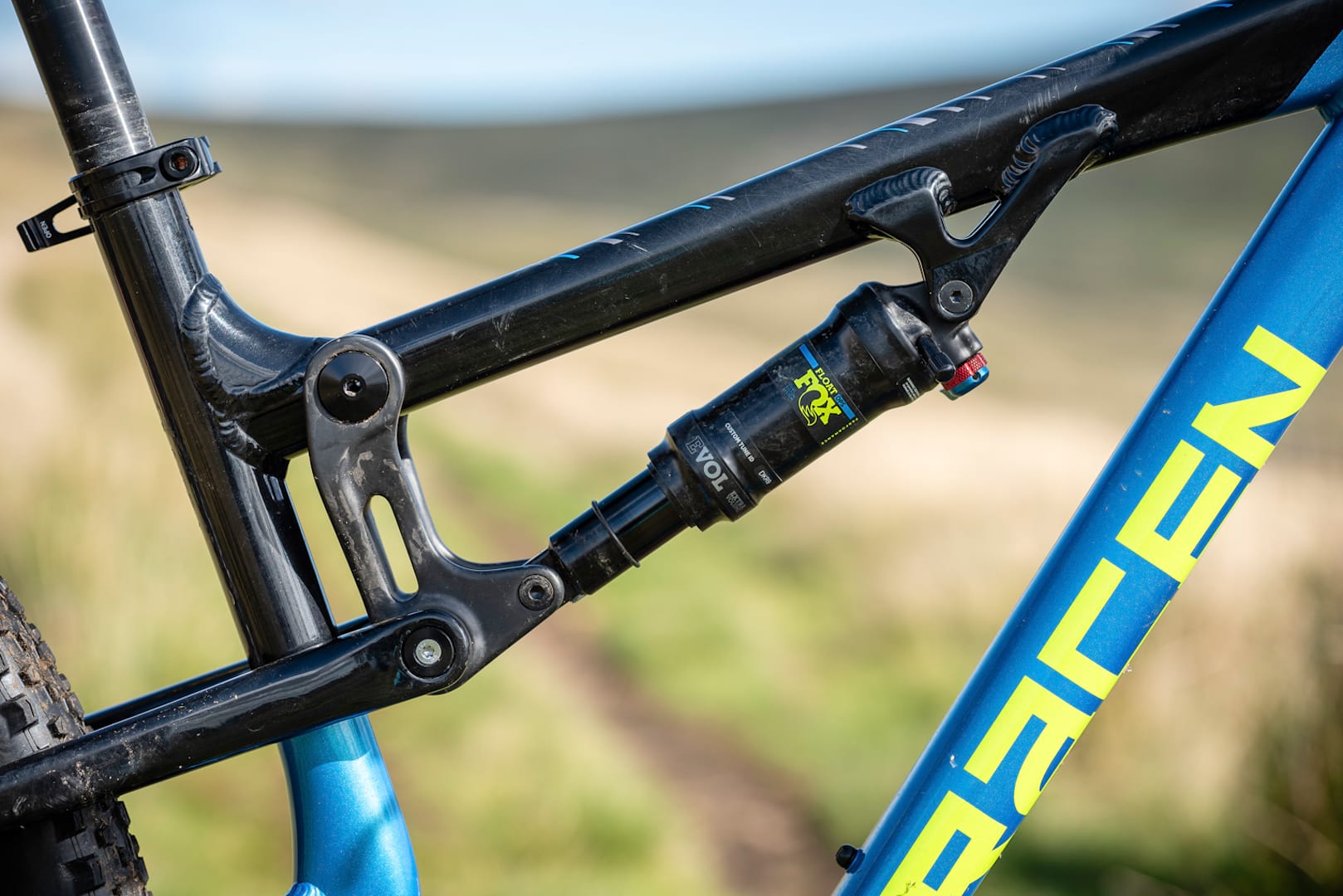 A pretty bold electric blue and black colour scheme hides some neat welding and simple, no-nonsense frame design. There’s room for a bottle cage (as with all bikes on this test) in the main triangle, which it shares with the (carbon) linkage-driven Fox shock. The seat tube is wide (or is that deep?) where it meets the bottom bracket shell, curving gracefully, but fairly dramatically back over the rear tyre. There’s a hint of seat-mast, but not nearly as much as on the other two. This laid-back seat angle ostensibly measures a pretty slack 72° and taller riders will find their saddle heading further back as the saddle height increases.