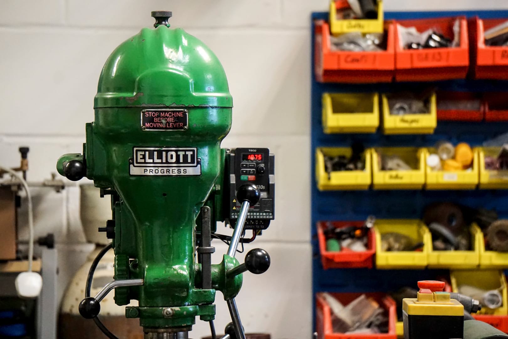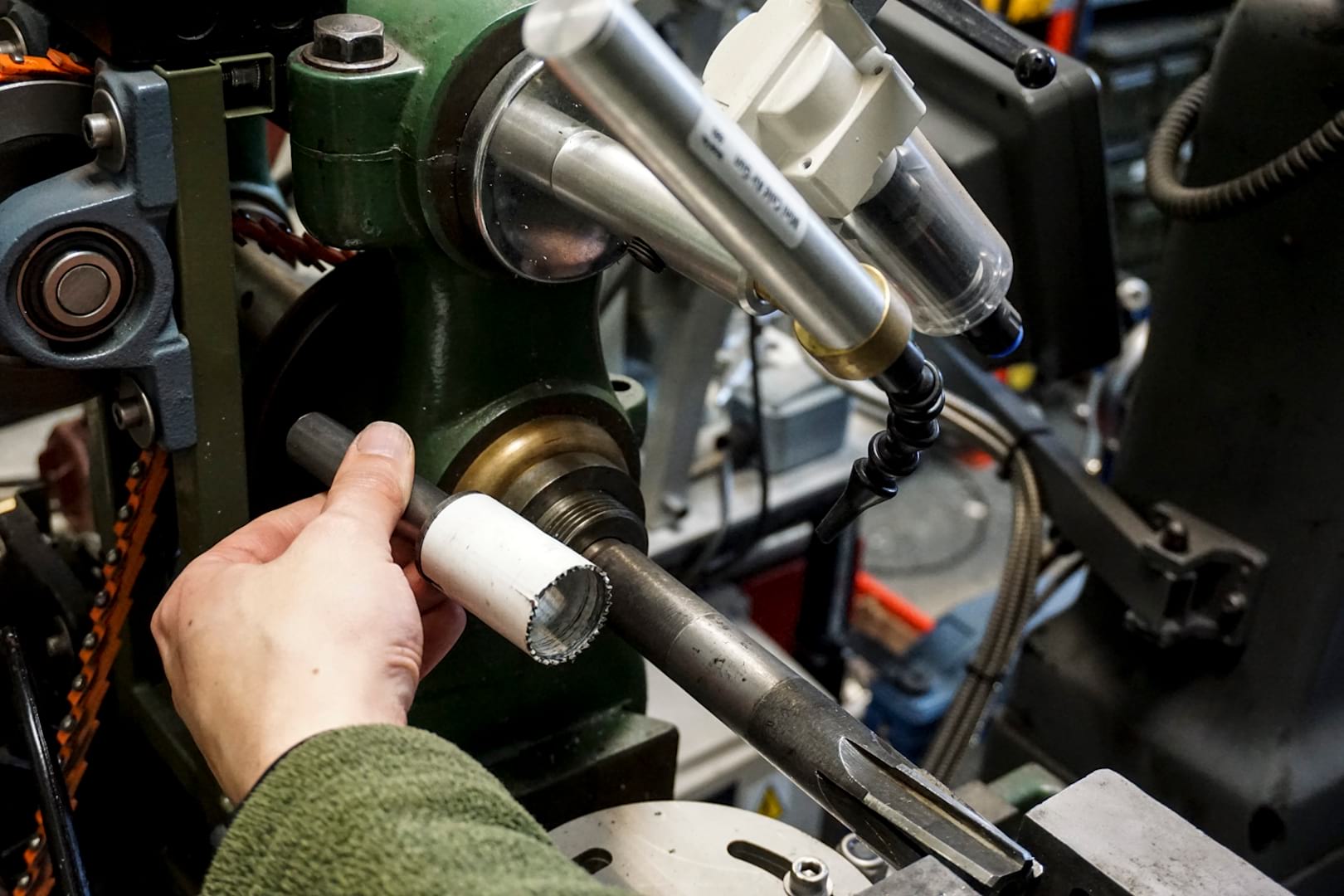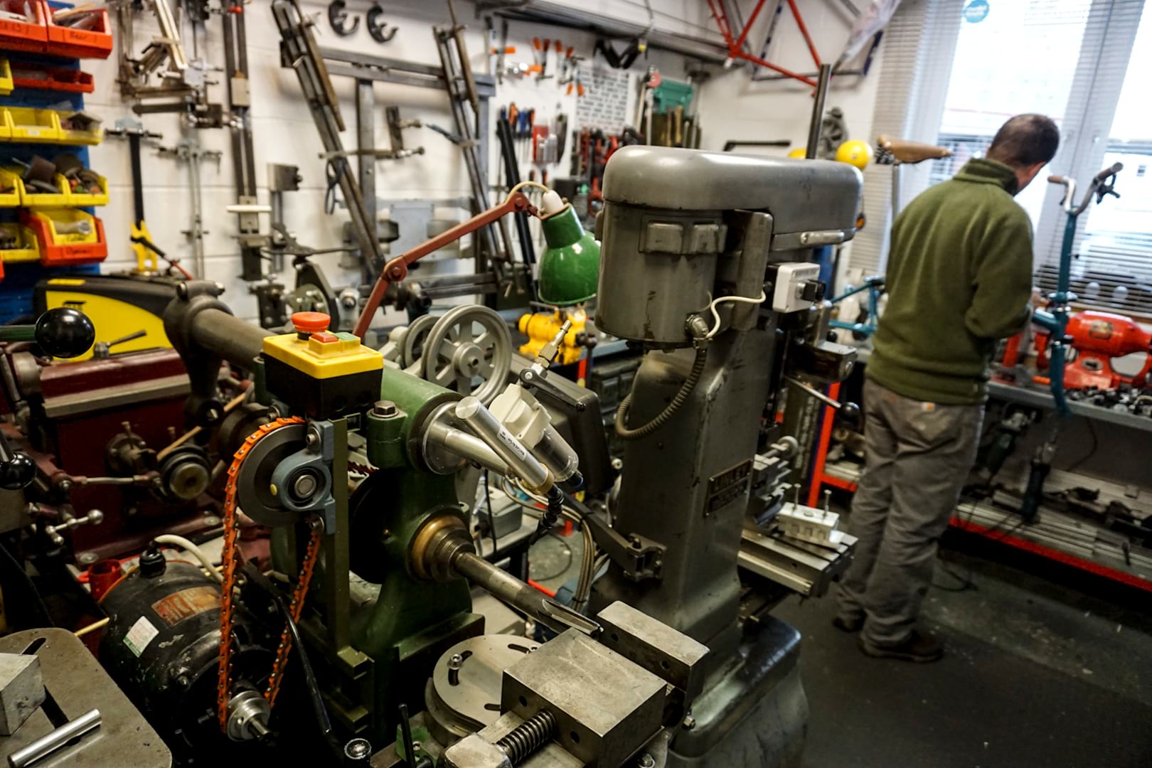 Stepping into Ben’s shop, ostensibly for the purposes of an interview, I was immediately drawn into a world far removed from the standard cookie-cutter bike shop that sells the same stuff as pretty much every other bike shop. Where there would normally be a workstand, there is an entire engineering workshop. And I’m not just talking your bog-standard hammer-action drill and bench. No sir, this is a world of precision-engineered lathes, spoke threading machines, frame jigs and an industrial drill that could probably be used to build a second channel tunnel. As heavy engineering works have gradually disappeared, Ben has been quick to snap up old machinery destined for the skip. They say they don’t make things like they used to. Ben’s workshop is proof positive of this. Under his supervision, I try some of them. Their smoothness of operation and feeling of built-to-last quality is nothing short of incredible. When they were designed and built in the early part of the twentieth century, the throwaway culture of today simply did not exist. What would have cost perhaps tens of thousands of pounds new were snapped up by Ben for a few quid. Recycling done properly, I think to myself.