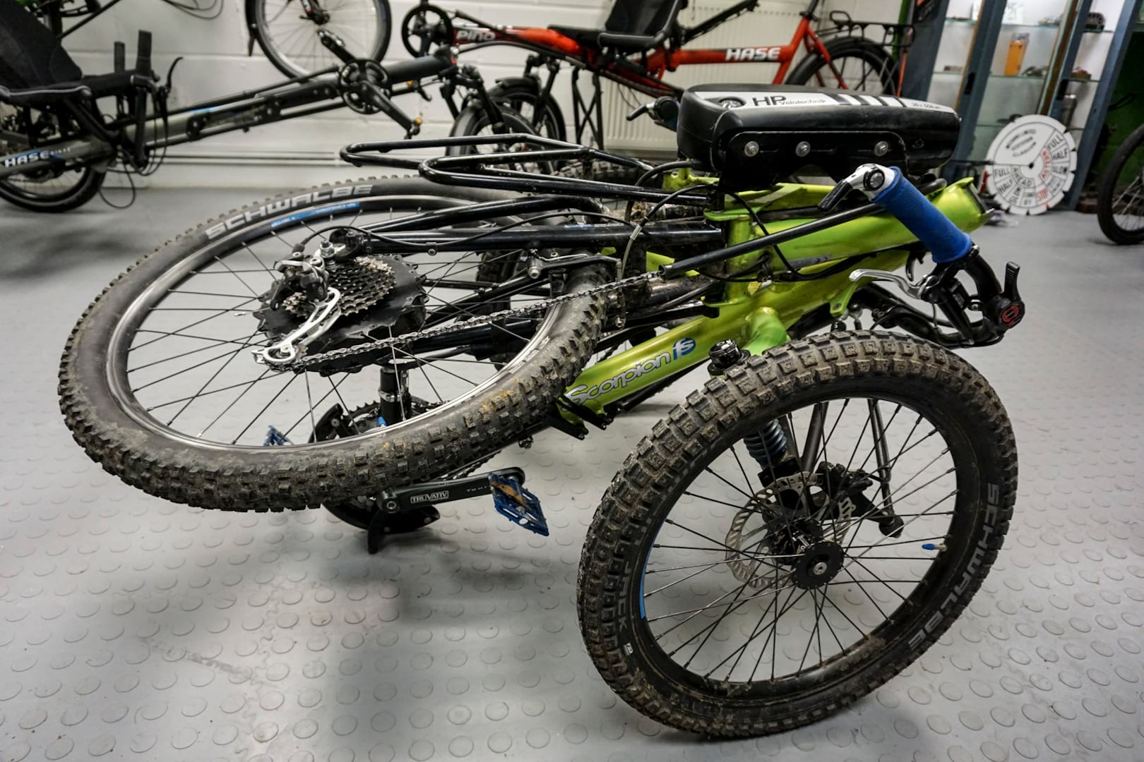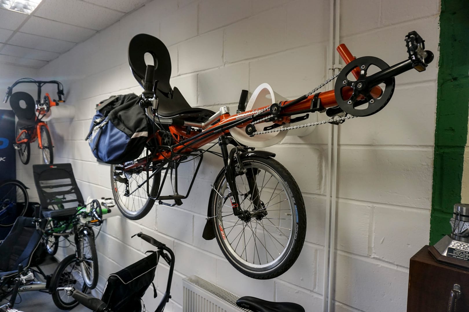 With old signs, heavy munitions boxes repurposed for storage, and what can best be described as urban bric-a-brac visible in every direction, I suggest to Ben that it feels like a museum. He smiles and takes me through to the showroom. Stepping through the door, I feel like I have just found Charlie’s golden ticket. There are bikes, but not run of the mill bikes. On the wall, a Birdy takes pride of place while below it there is a beautifully crafted Moulton Spaceframe. A couple of Bromptons that have received the special treatment from Ben and now sport disc brakes and a Rohloff drivetrain catch my eye. Turning round, I am greeted with pretty much every type of recumbent on the market. Two-wheeler, carbon race bike – tick! Three-wheel, low-slung speed machine – tick! Electric off-road recumbents – tick, tick, TICK!