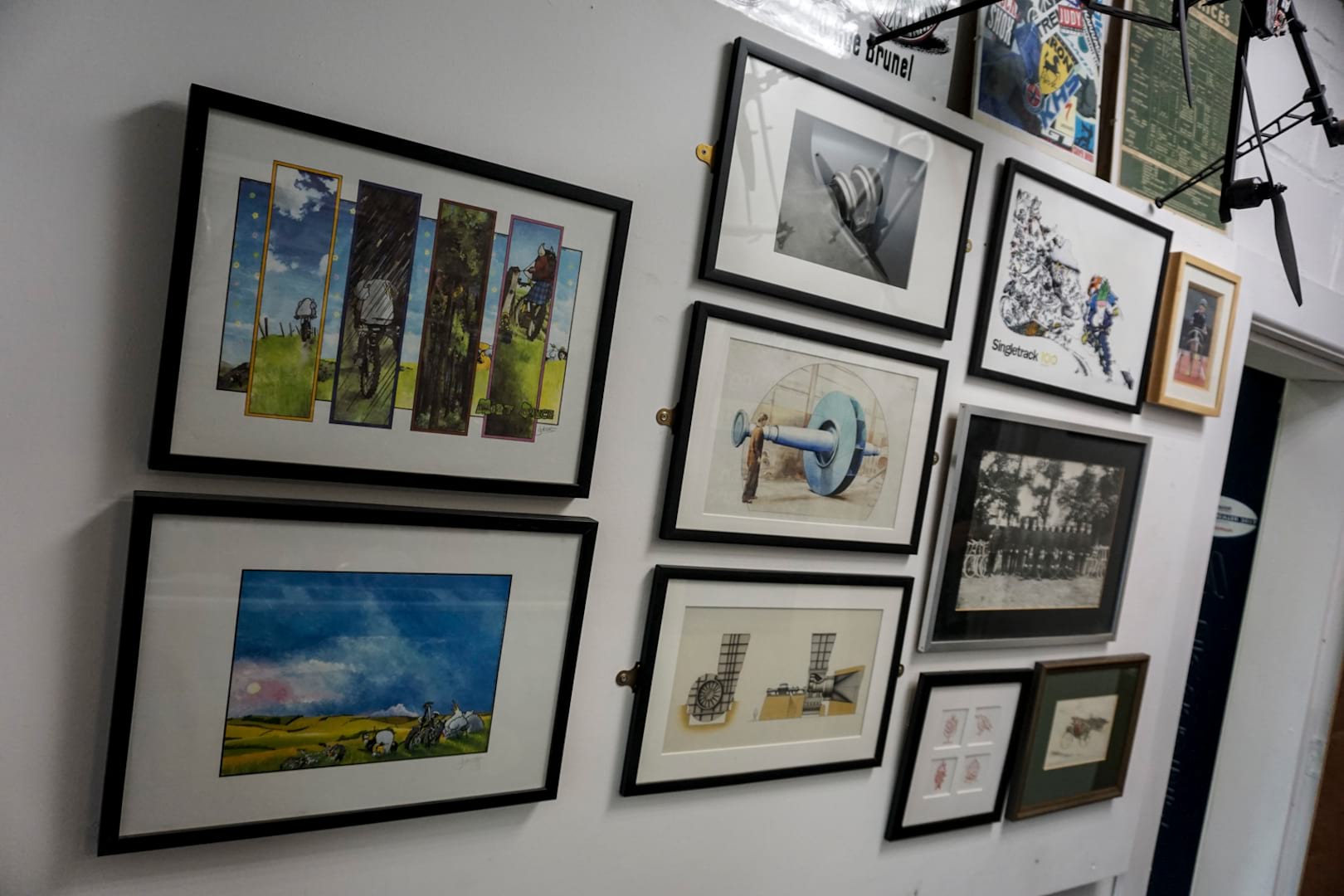 As I look around the room, on the wall I see an old Kona mountain bike with S&S couplings, the first he ever did, while in another corner, a Rohloff and disc-sporting Brompton sits awaiting delivery to another satisfied customer. But then the oddest of things catches my eye. “Is that a stretcher?”