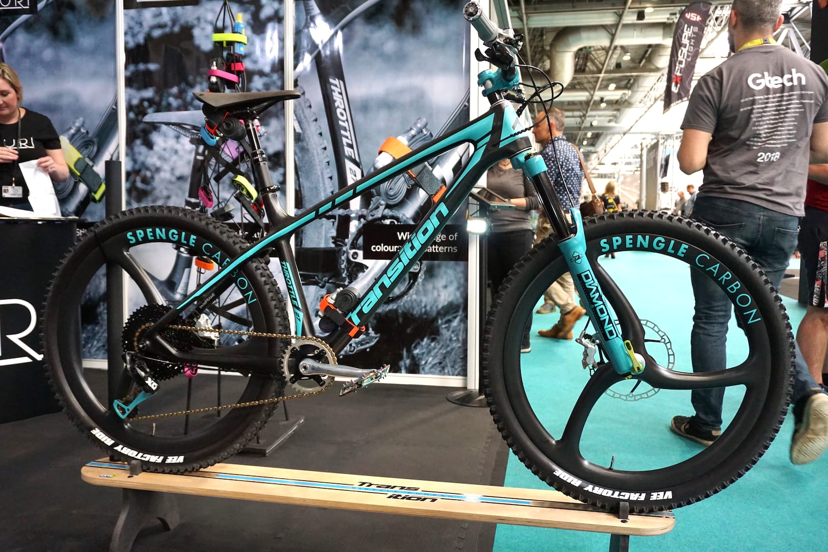 Cyclorise had kitted out this custom Transition Throttle with a few of the brands that they distribute, along with a few items that had been custom painted to match the one-off decals. Up front, there’s a DVO Diamond fork painted light blue, and around the back, the SRAM rear mech had been painted to match. Spengle wheels aren’t all that common and were so new that they had only just arrived in time for the show. Cyclorise distributed parts include a Brooks saddle and StemCaptain top cap with a built-in clock!