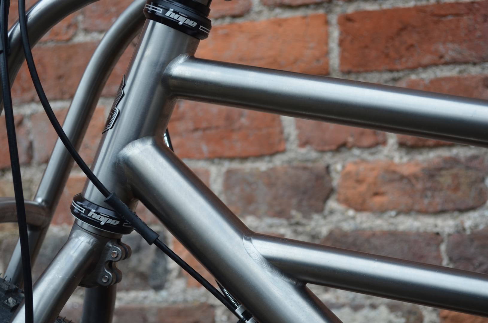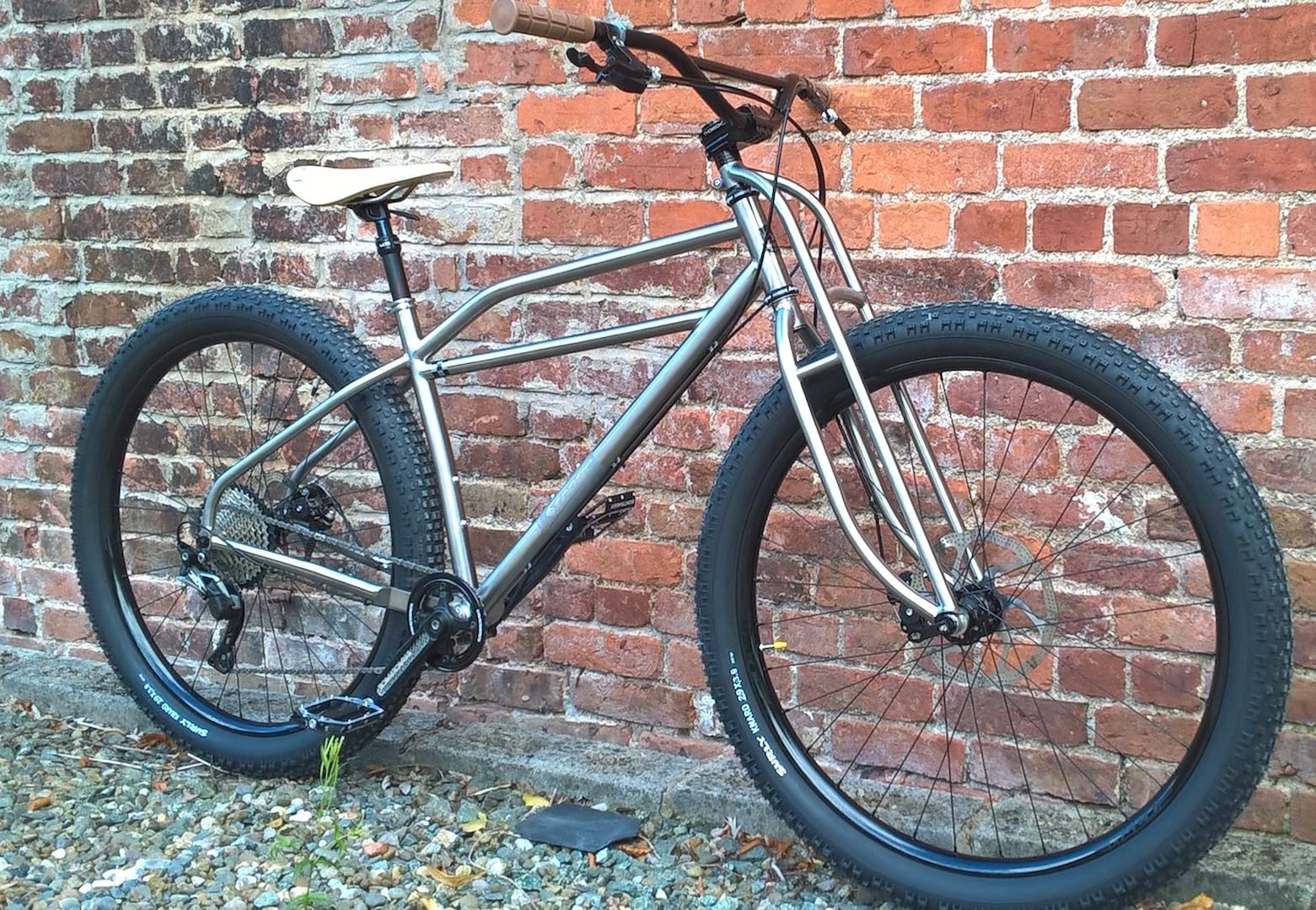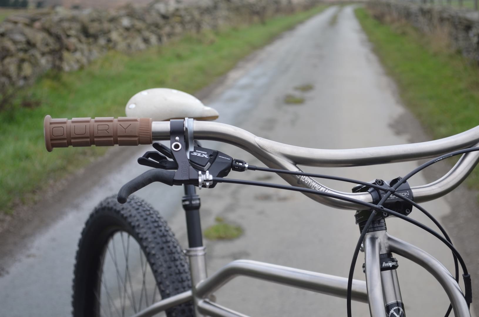 Made from titanium and in a very select quantity of just ten, the Dirtbomb includes some interesting geometric features for a non-suspension mountain bike. For a start, it has a 66° head angle, and an enormous 630mm effective top tube. Andy has built the Dirtbomb around his own truss fork design that features no fewer than 80mm of fork offset – the idea being to decrease the mechanical trail to reduce wheel flop with those big 29+ tyres.