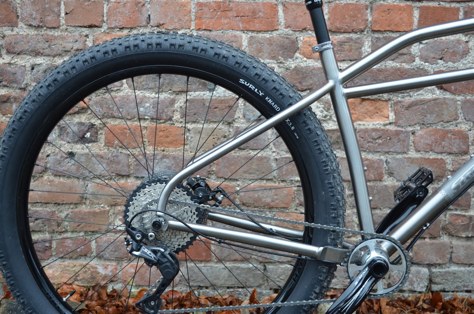 With a rigid bike, the further you can get the front wheel in front of the steering axis, or more specifically, the further you can get the rider’s weight behind the front wheel, the less punishing the bike feels. People often asked about the need to keep the front wheel weighted, it’s counter-intuitive to many, but an unweighted front end is only a problem on a bike with a suspension fork, a plus front tyre provides all the insurance you need not to wipe out on a rigid bike. So the Dirtbomb is an experiment in getting the front wheel stretched out and up front as a means to attack trails harder and faster and with more comfort.
