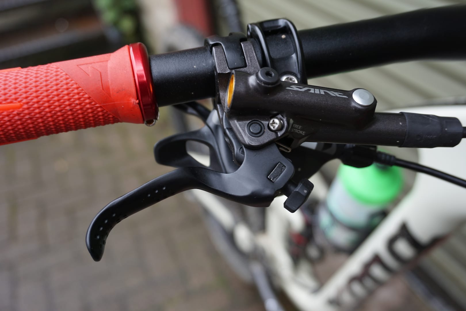 Another step away from the stock spec are the brakes that have been upgraded to Shimano’s top end DH Saint stoppers. 4 pot calipers and big rotors give plenty of power and control for reigning it in when things get rowdy.