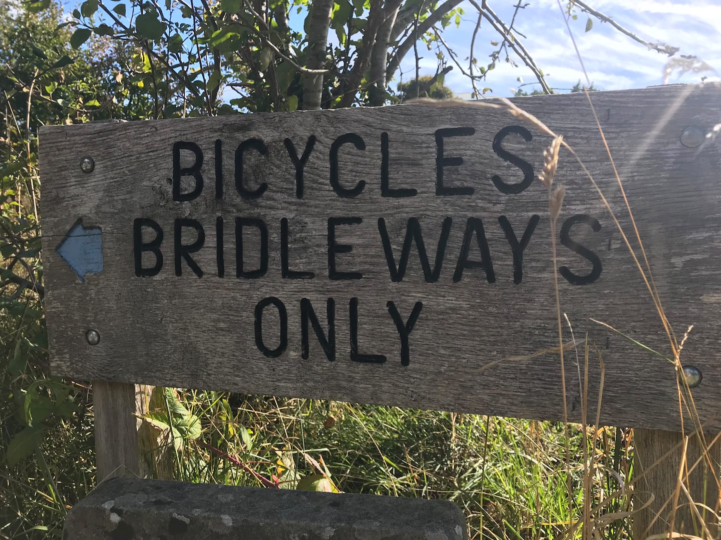 In my view, the section we ride on the Friday was the best – which is possibly convenient as it’s also the bit closest to London. It’s not really mountain biking as I know it – this is not knee pad territory, and there’s a distinct absence of thrills. But it is more or less off road, and there is delight to be had, wiggling through trails that somehow feel like surely they’re not legitimate. We catch a perfect autumn day, the ground is dry, the leaves are crisp, and there is just the hint of that autumnal smell of summer growth starting to die off and decay. Under a bluebird sky we ride along trails which appear little walked or ridden as the weight of a summer of growing droops stems across our path and whips our legs. Linking them all together is a challenge, even with a GPX file to follow – is it this left, or that left? Do those paths join up on the other side of that tree, or head off in different directions? The sign posts are not helping – there are rotten ones propped up, whose arrows cannot be trusted, and others which have so many arrows on them that they look more like a boy scout’s badge collection that a way marker. This is a part of the process that’s still to come – once the access agreements are all ironed out, there will be the process of properly marking the trail so that it can be followed easily – something Cycling UK hopes to achieve in the future, although that currently seems a long way off. The intention is that this will be an official National Trail, like the Pennine Bridleway, which means there’s a bunch of government department administration to be dealt with first. Good luck to all the poor souls navigating that.