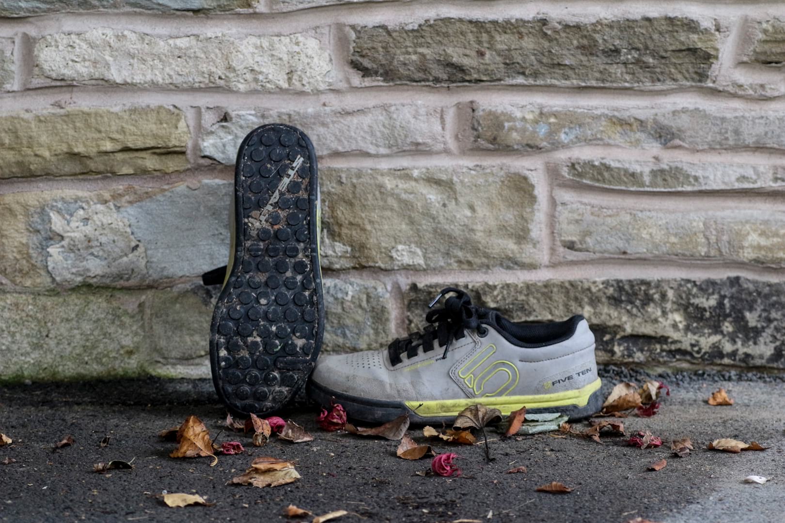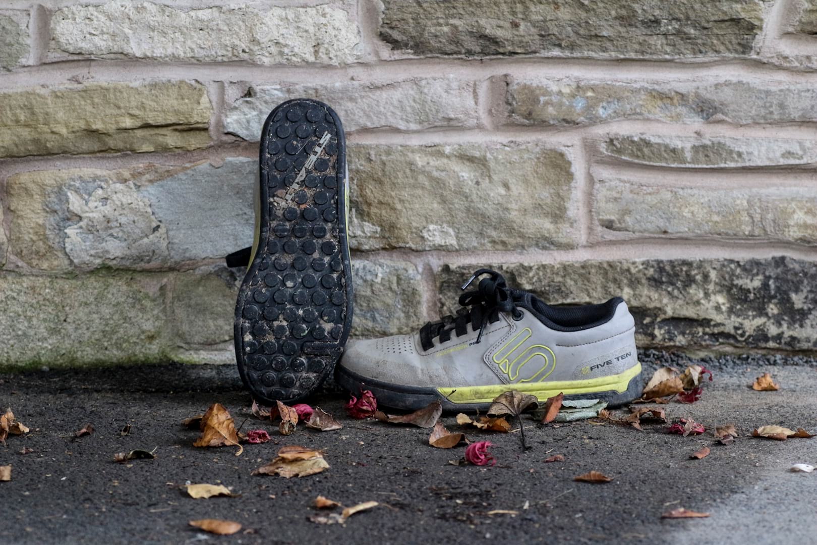 The first time I wore the Five Tens was for a skills practice and drops session at a local trail centre. Ride down, drop, push back up, repeat. I figured that the super-sticky rubber would be ideal for the task, and make sure my feet stayed in contact with my pedals as I smashed and bashed my landings. I was wrong. The super-sticky rubber stuck to my DMR Vault pedals, wherever I put my feet. I’m no master of corner carving, and I’m no queen of track standing, so sessioning inevitably has me needing a decent run-up, or a quick reshuffle of feet to get them where I want them on the pedals. The Five Tens were so sticky that rearrangement wasn’t possible, so I found myself heading over drop-offs with my feet in some strange and unbalanced positions. The shoes were also super stiff, on both the soles and the uppers. While the soles proved no problem, the uppers actually bruised the tops of my feet where the toe folded as I walked. Not an auspicious start.