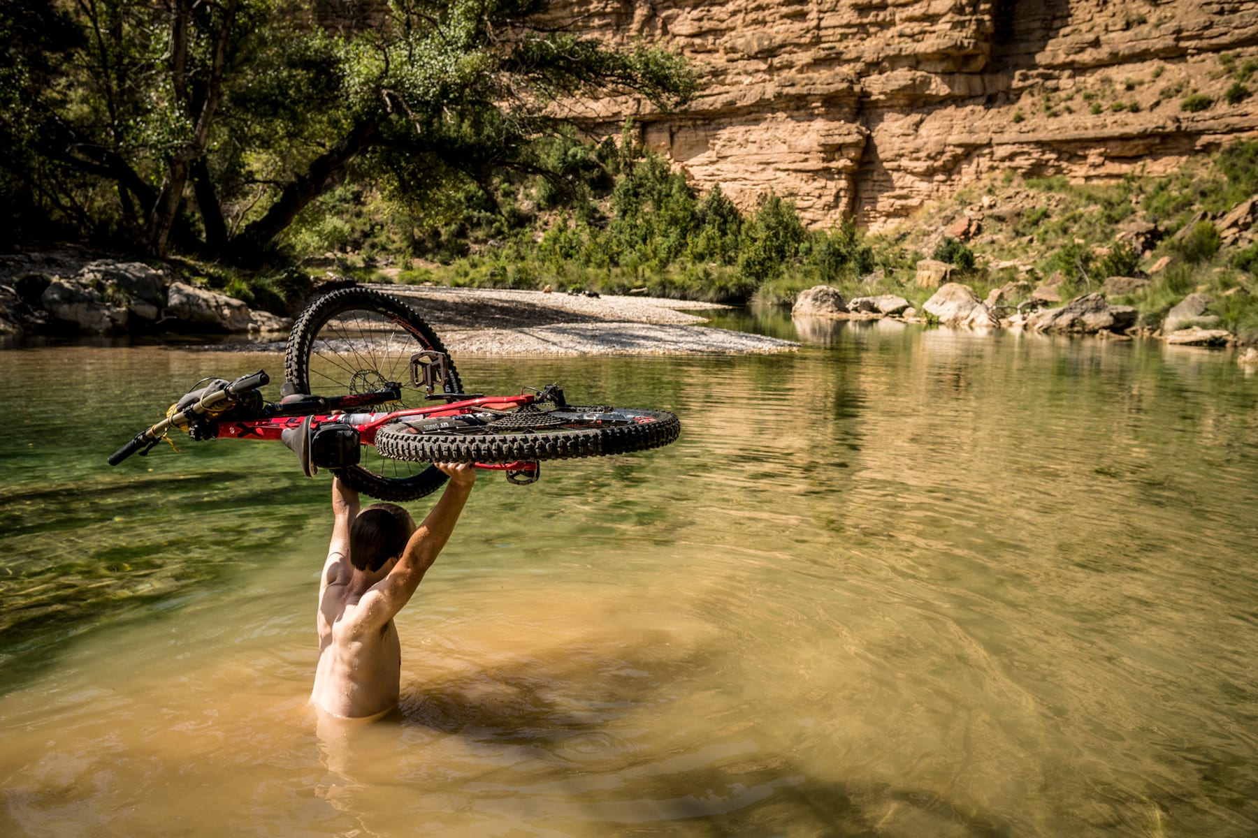 Into the oven we went, navigating heavily rocky but fast and very rideable terrain. By now Ben and I had refined our set-ups, moving as much weight as possible out of our backpacks and onto the handlebars, frame and saddle packs. The bikes were heavy, but we were able to ride almost as normal, enjoying fast turns, rolling over enormous boulders and dropping down steep chutes. Victor was still experiencing the effects of his over-planning, particularly as the anchors were unexpectedly slammed on each time his drooping saddle pack came into contact with the rear tyre. We all enjoyed a cooling swim in a perfect basin, the sight of a watering hole quite a surprise in this desert-like area, before once again hauling ourselves out of the canyon and into more rolling lands.