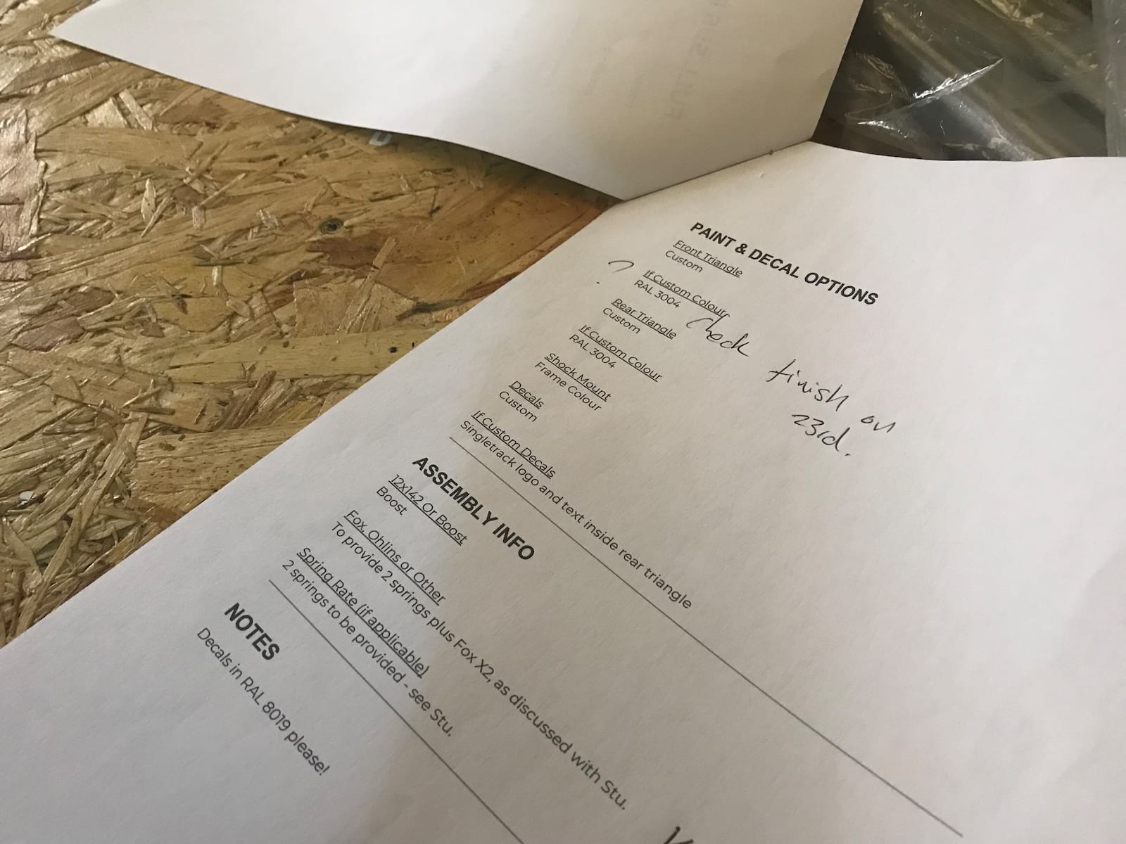 After much debate (‘no, you can’t just have grey, it needs to be a colour for the photos’) I opted for RAL 3004 ‘Purple Red’ (Translates as a rather pleasing purpurrot in German) for the frame, with RAL 8019 ‘Grey Brown’ for the downtube decals. We also opted to add a Singletrack logo on the inside of the rear chainstay, just because we could. As well as being pretty in their own right, we thought that these colours would coordinate well with both the orange Fox suspension decals and the yellow Ohlins shock that I plan to test on this bike.
