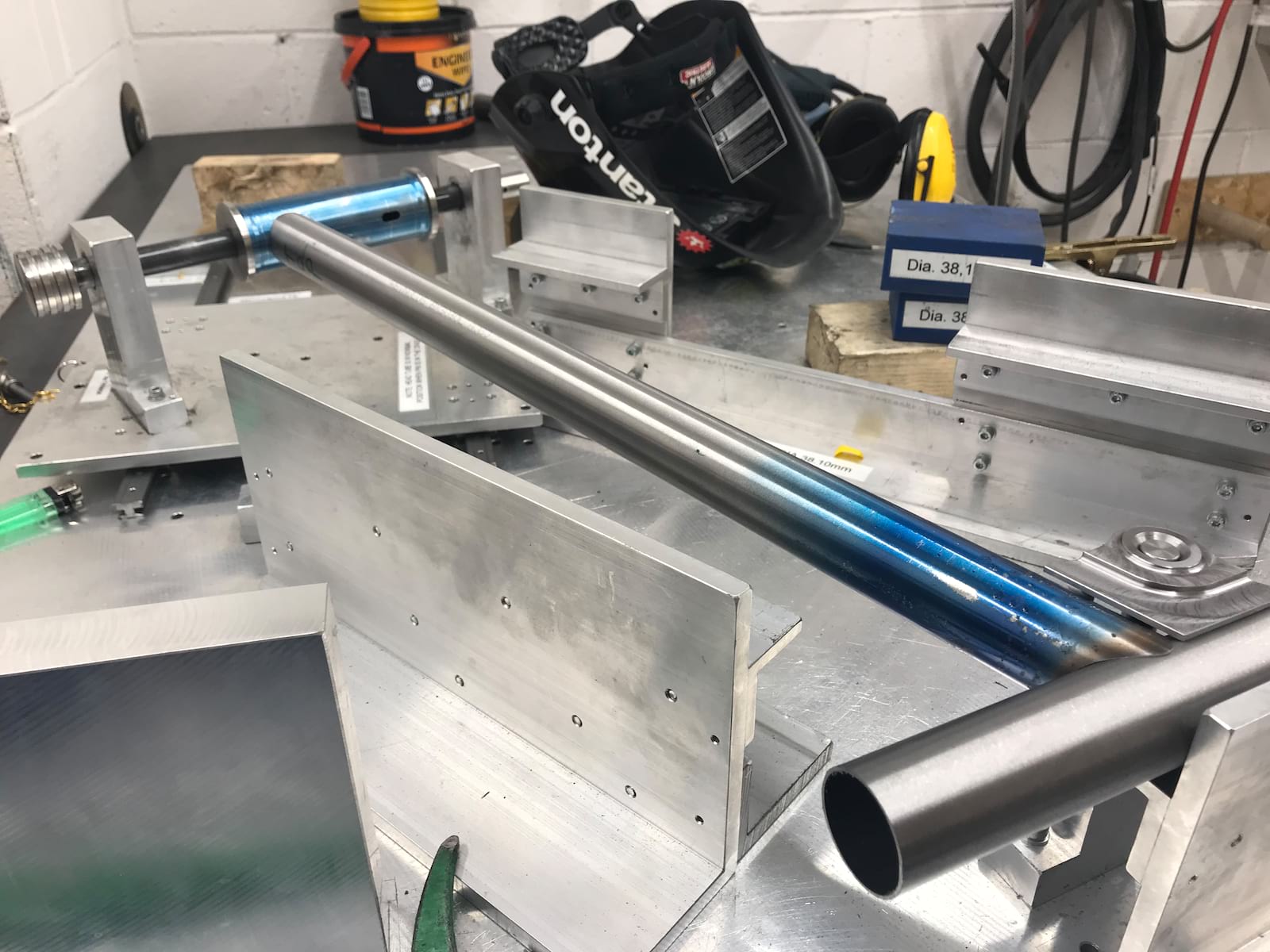 Continuing the ‘made in the UK’ theme, the rear triangle is made from a ‘dog leg’ piece which is CNC’d by a friend of Dan’s in the UK. These are joined to the rest of the triangle components using aluminium parts from Aalco in Leicester. This 29er has wall thicknesses of 1.6mm on the rear stays to give a reasonable level of elasticity (The longer travel 27.5in Switchback FS has a shorter stay and thicker wall to stiffen them up).