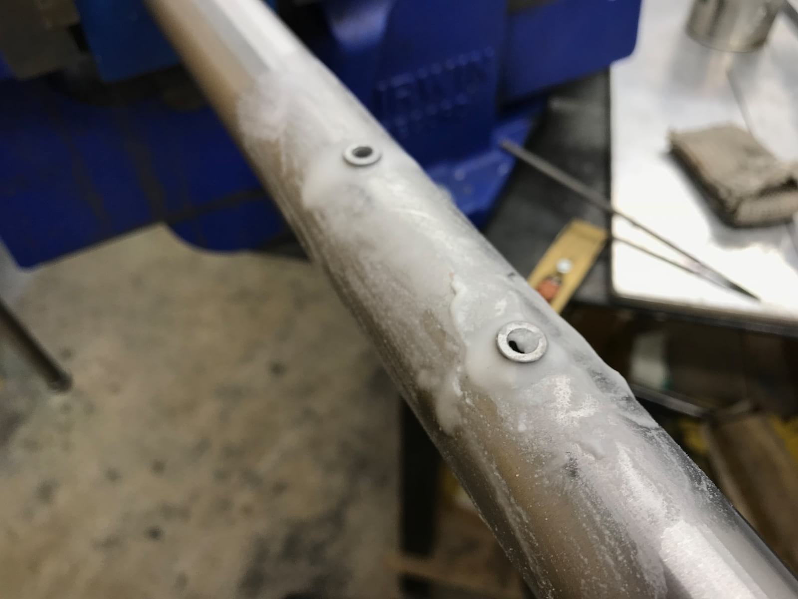 Having got all the tube lengths ready, it’s time to braze on the bottle cage mounts. My effort (a first shot at brazing) was a little sloppier than Gavin’s, but then he’s a super experienced welder with a background in oil and gas, used to working with some seriously complicated stuff. Anyway, once it’s painted, you can’t see the slightly burnished finish to my braze.