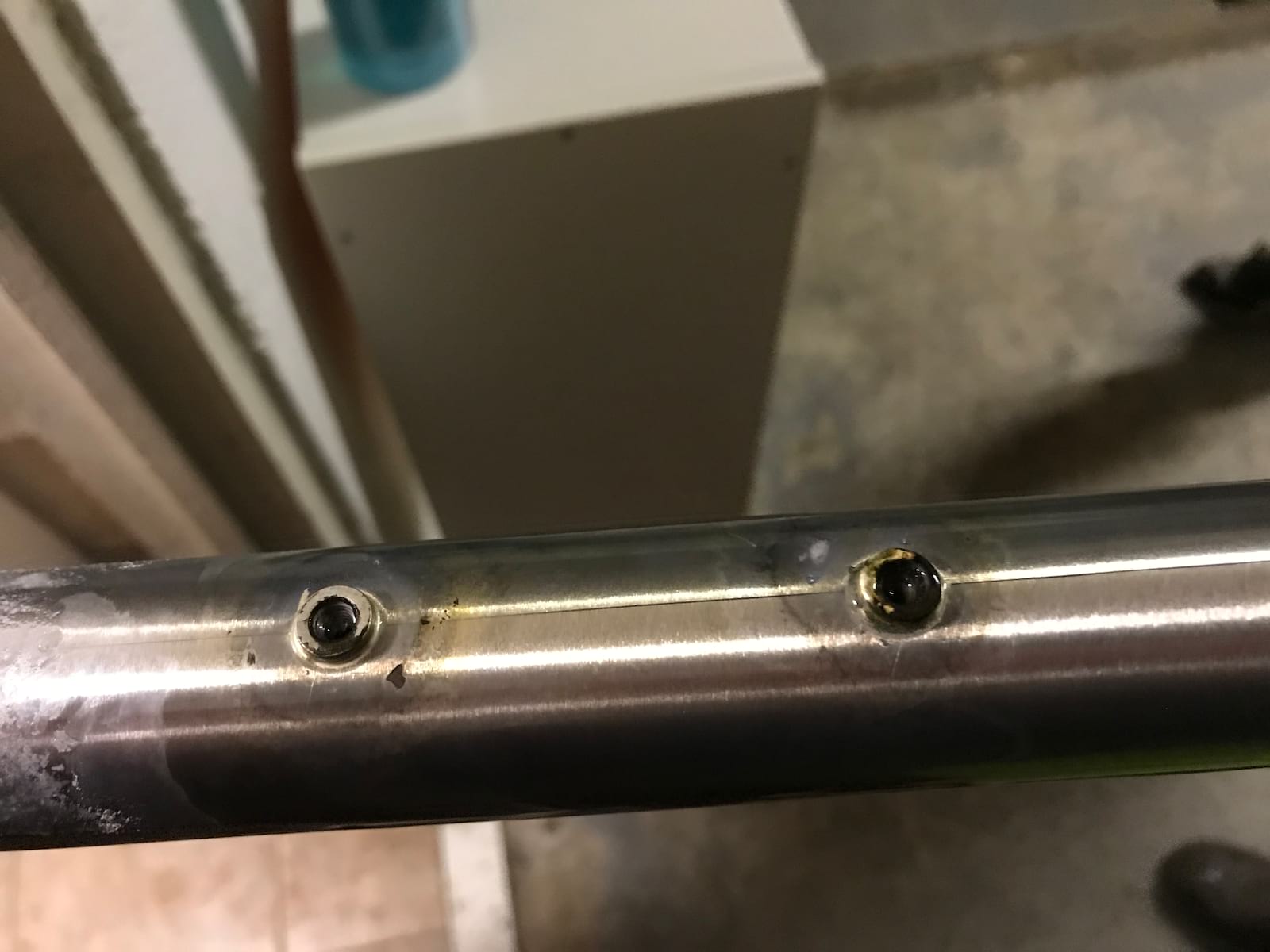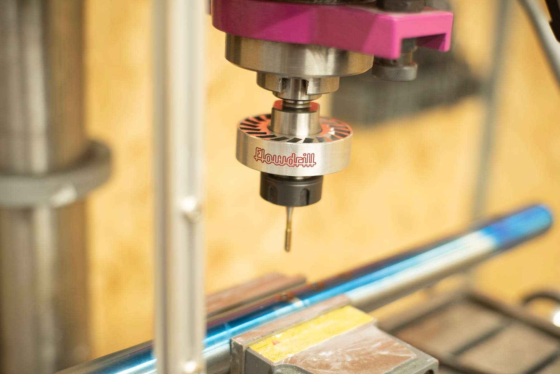 Once the tube lengths and mitres are correct, holes for bottle cages and shock mounts are plotted and drilled. Again, I was able to to some of this myself – plotting the spots to make the holes took me a little bit of doing, but watching Gavin do the same task made it look easy. Blue spray is used to provide a markable surface to plot the correct positions of the holes before drilling.