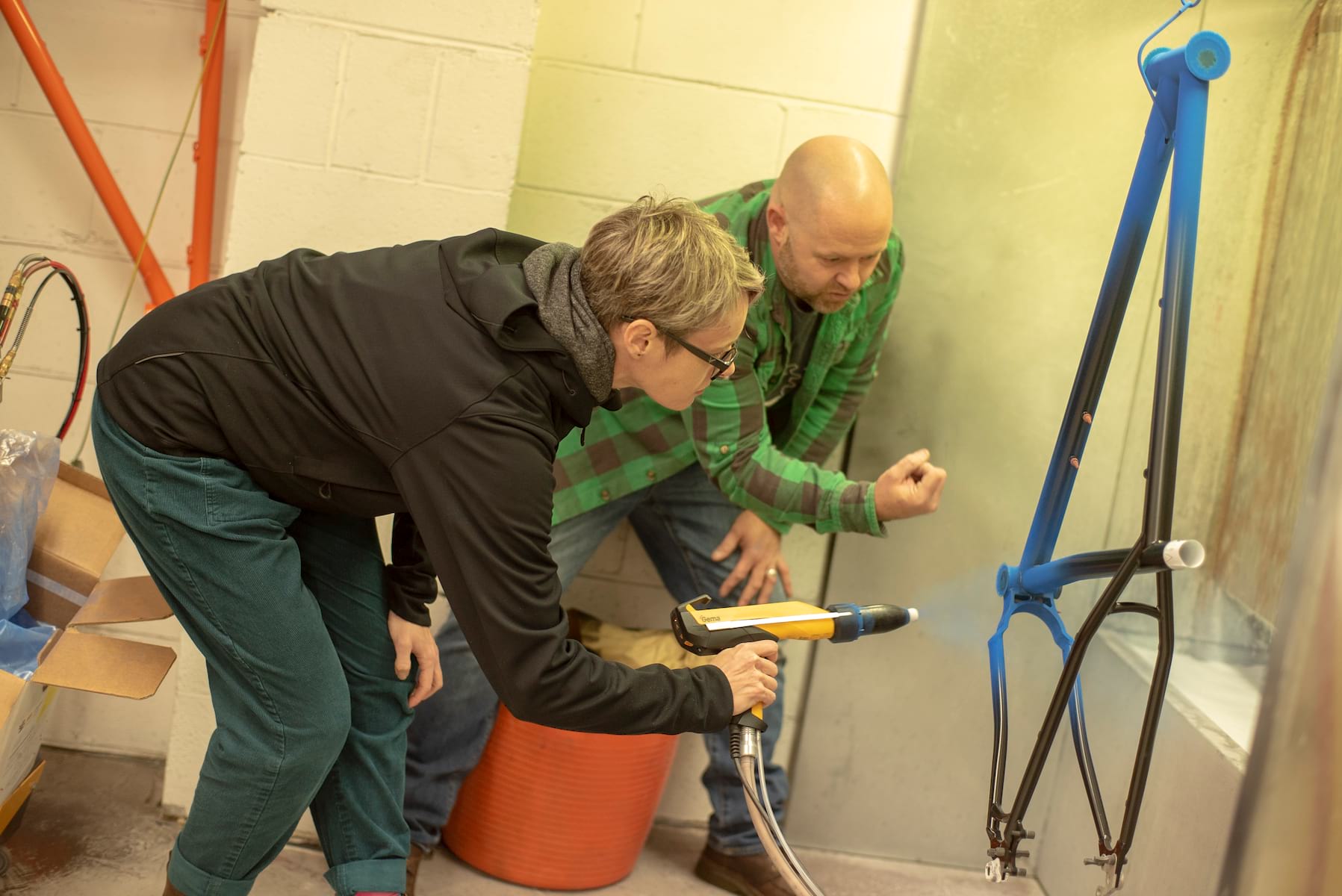 Each frame is fitted with a selection of bungs to keep the powder out of threads and holes where you don’t want it. Then it’s sprayed with the colour of your choice, baked, and the decals applied, whether painted or stuck on. A clear coat provides a final layer of protection, and the bike is ready to be either shipped as a frame, or built into a bike.