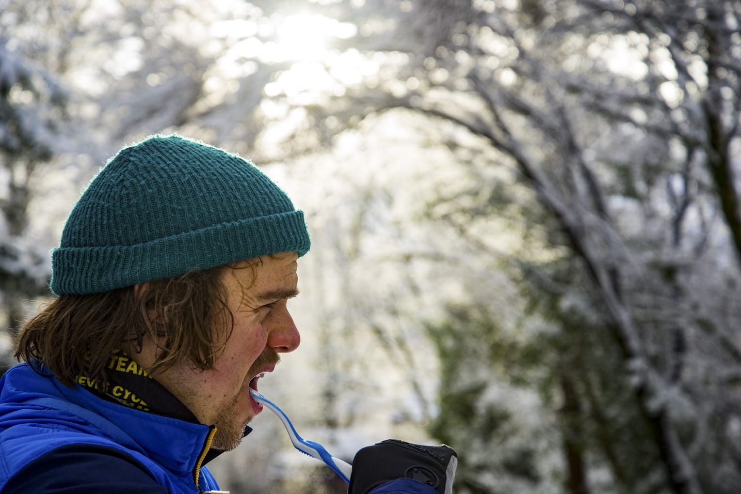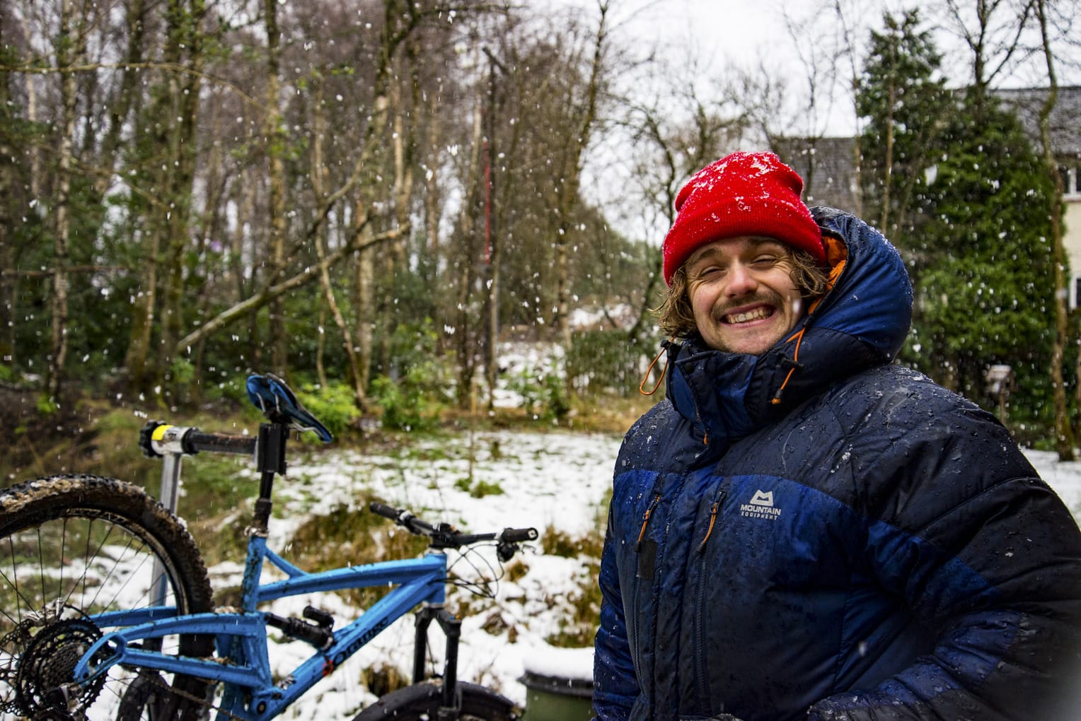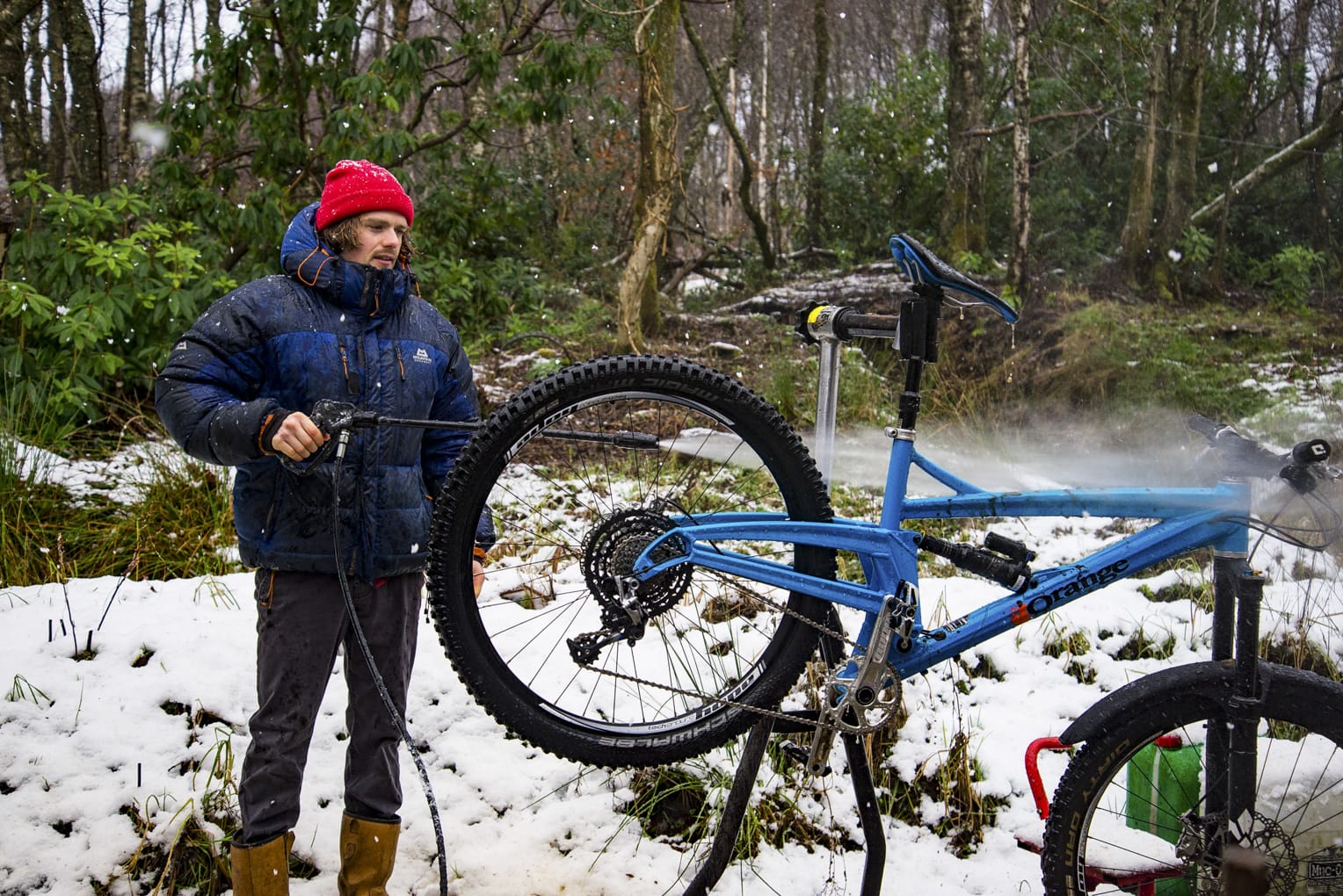 Before we load the bikes into the van, Joe whips out his all-terrain slippers (no, really) and swaps his cold, wet riding shoes for something altogether more comfortable. With toes warming nicely he tucks into the culinary delight that is tinned sardines on oatcakes. Back at the ranch, we thaw out with another gallon of Barleycup before getting the bikes clean as a whistle as the fresh snow falls.