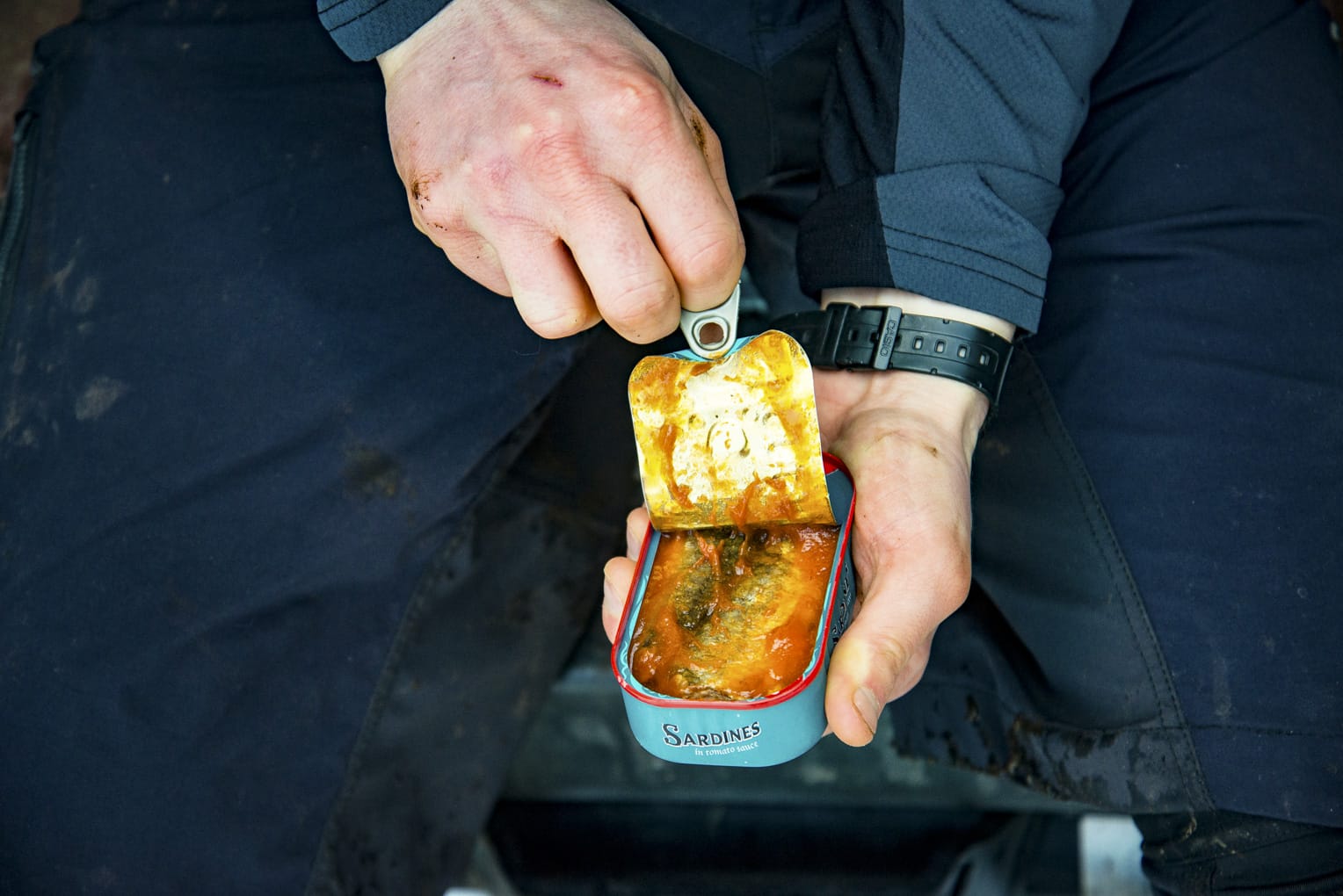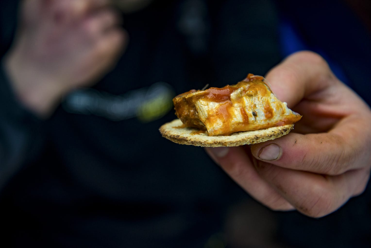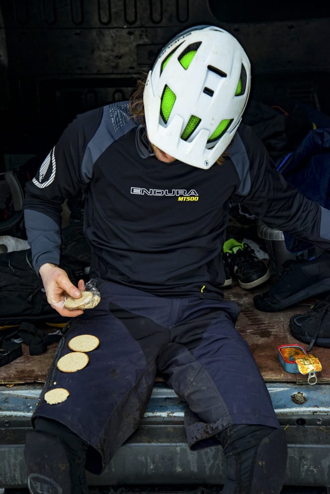 After a relaxing breakfast with its lack of urgency, it’s time to step up the pace and, once on the bike, urgency is something Joe is renowned for. Especially when grip levels are low and the flanks of a rut are starting to trouble the knees. We load up the freshly liveried Dudes Racing Transit and roll up the Great Glen with views across the Nevis Range to one of the many hotspots of ‘classic’ Fort William riding. Alongside me on the inside passenger seat is the Joe Barnes go-to ride fuel. Not a classic in any other part of the world and maybe not even outside his circle of friends, but oatcakes and tinned sardines in tomato puree is what’s on the menu today.