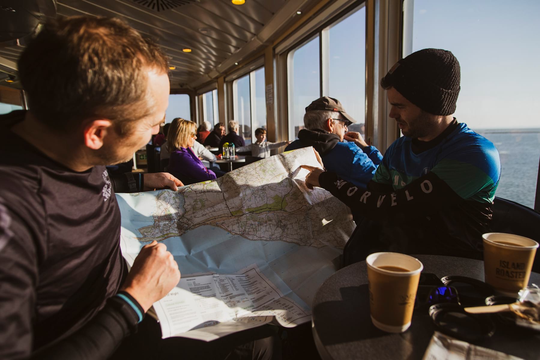 With no time to waste and the ferry already in its berth, we hurry along to the ticket office. Reaching the ramp just in time for it to go up, we hear the crackle of the captain’s voice booming safety info over the tannoy, lean the bikes up and head to the lounge. Our crossing is calm with a beautiful blue-sky day, so we know our luck is in for today’s adventure.