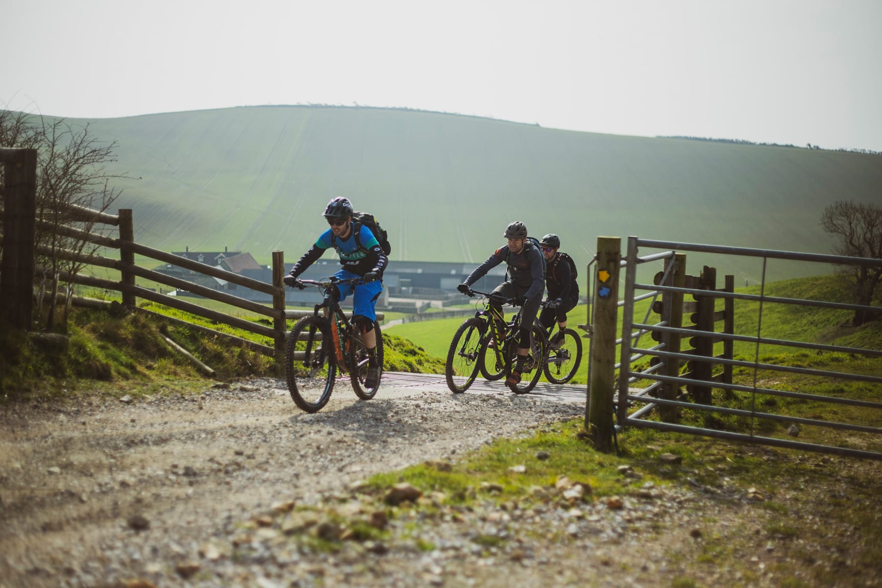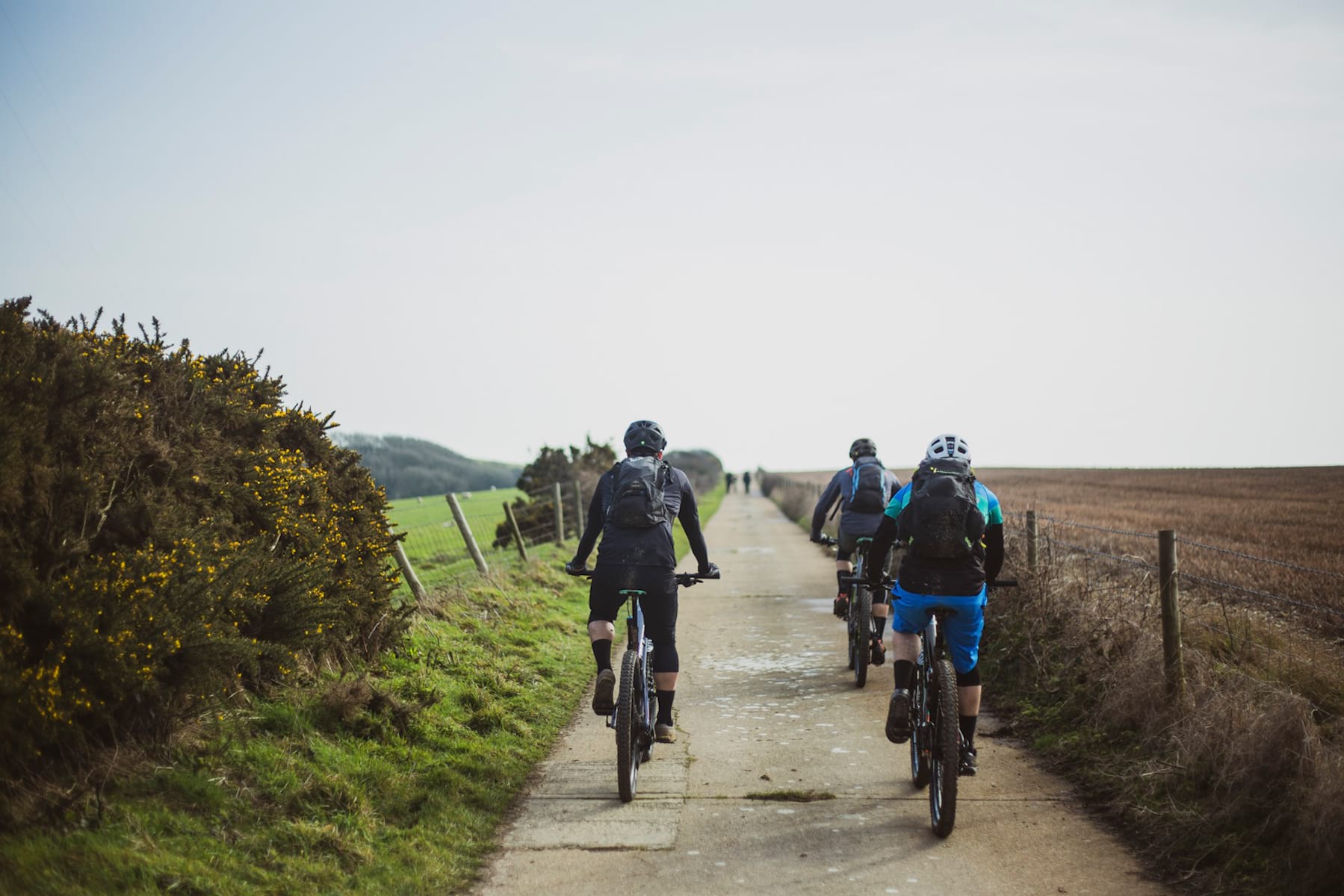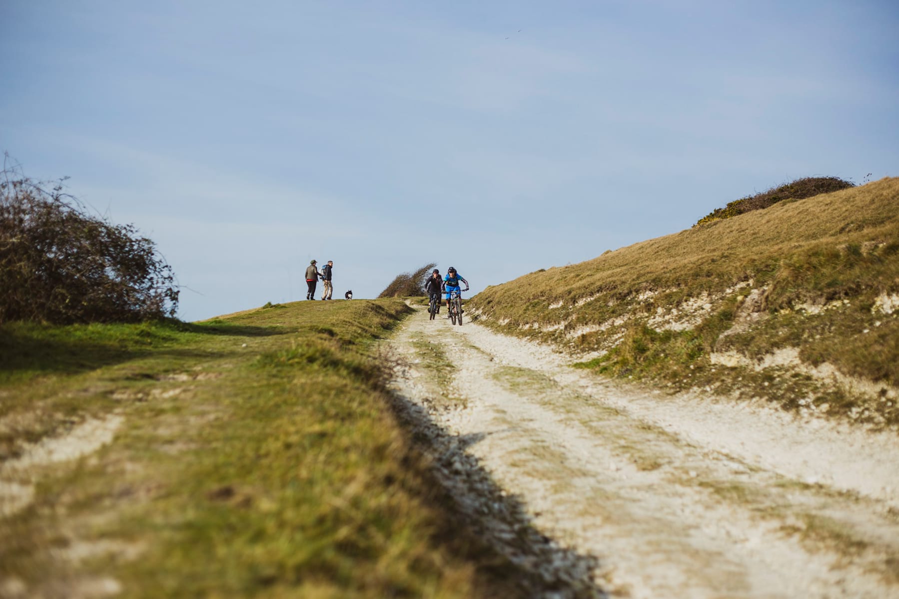 As tiredness begins to set in, I attempt to lighten the mood with Adam, reminding him this was the second to last climb of the day just as the next challenge emerges into our eyeline. We retrace our path from earlier, select a comfortable gear, set our own rhythm, and winch up the white chalk climb of Compton Down, inhaling deeply of the clean sea air. The theme of the day continues with the familiar view of Jon’s back slowly slipping away from us as he skips up the hill with ease and comfort. The gap goes from one bike length to five in a flash and before I realise it, he reaches the top and is over the crest out of sight.