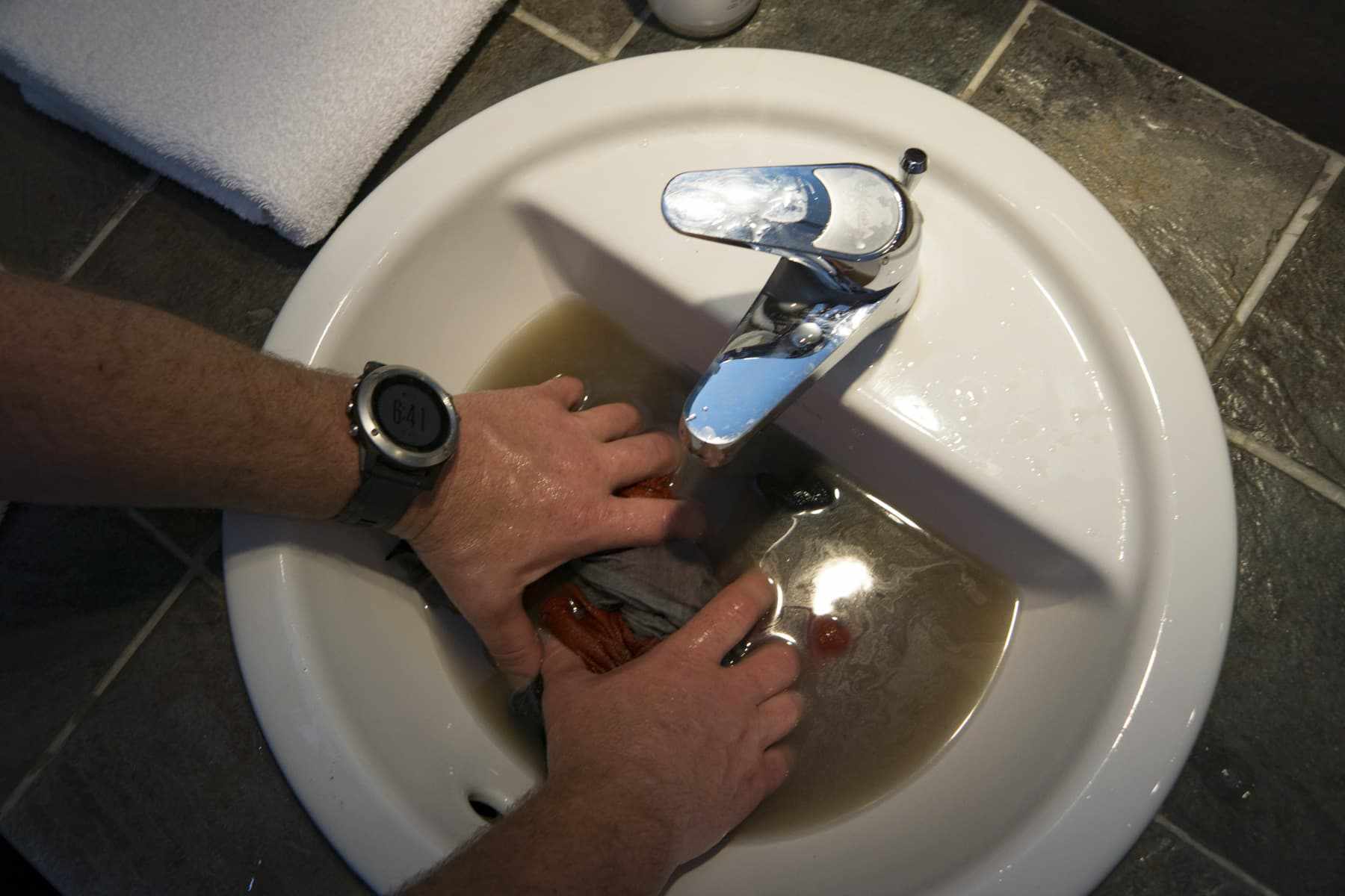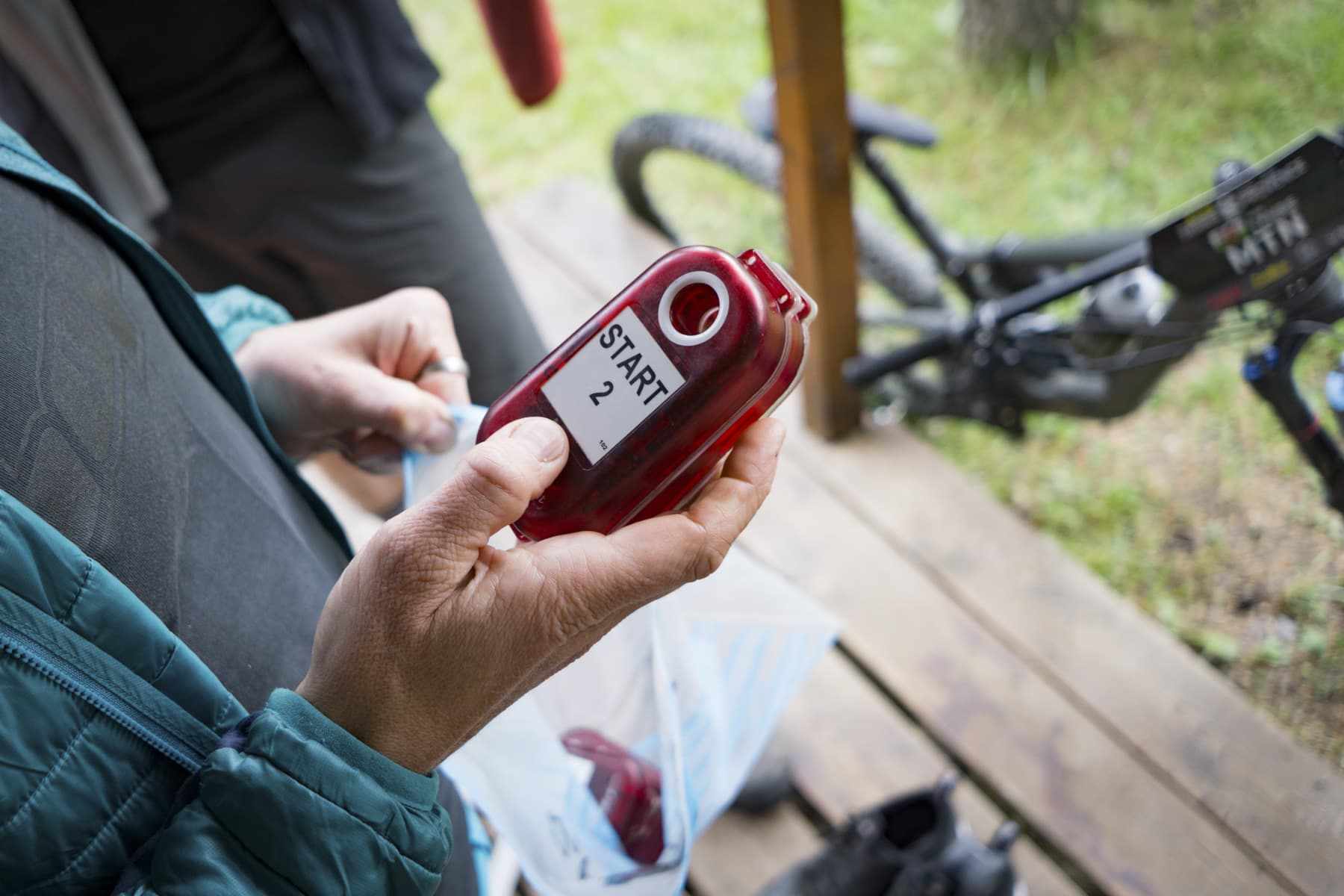 Four mountain staff – Toby, Ross, Julia and me. We set off before the riders and check the signage. Add more where it is vague: this is most important on timed stages where missed corners or cut-lines can make all the difference. Place a start timing box at the top of each stage – one of us waits at the bottom, while the others continue on, until the last one reaches the bottom of the fourth stage of the day. We get the pleasure of being first on the mountain, last off.
