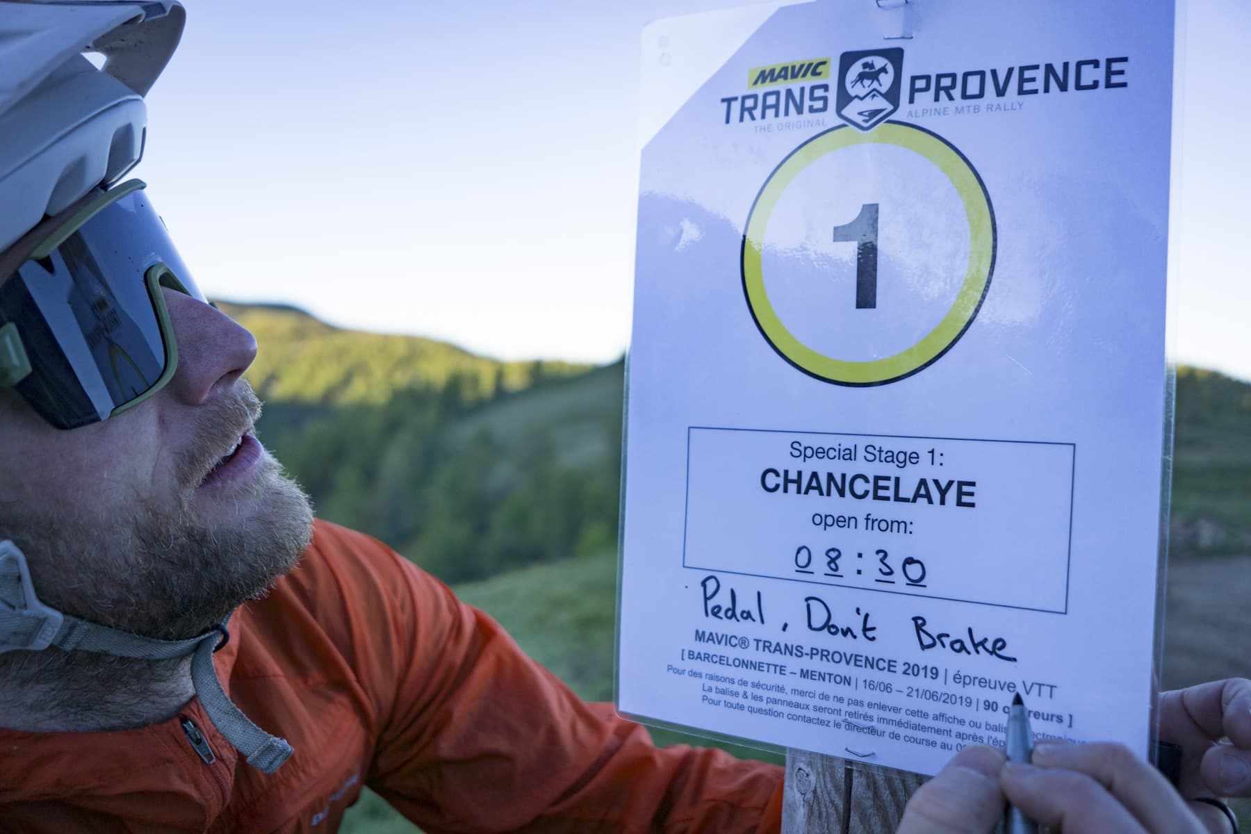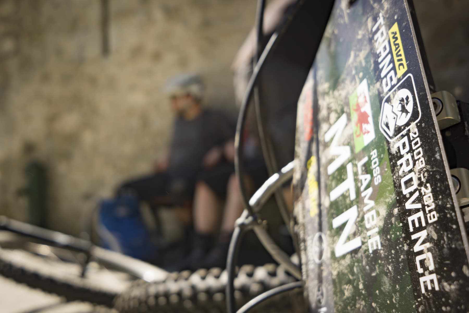 What’s Trans-Provence? A quick explanation. First run in 2009, TP is the self-titled ‘Original Alpine Mountain Bike Rally’. Each year it has run from the jagged-peaked mountains of Haute Provence down to the Mediterranean coast. The race takes place over six days, moving from point to point each night – a huge tented village collapsed as soon as the last rider has set off, and re-erected in time for the first riders at their destination. There are four timed enduro stages each day; the racer with the quickest time over those stages wins. In between the timed sections are varied transition stages – anything from hours of hikeabike through to wild, exposed descents too risky to run a stage on. There’s the odd vehicle uplift thrown in, to keep the descent to ascent ratio as generous as possible. This is enduro at its purest. Blind racing: no practice runs, few route cues, the minimum of taping and signage to keep racers on course. Each stage is predominantly downhill, but they vary from a few short kilometres to energy sapping longer tracks. Technicality ranges from ‘a bit spicy’ to ‘well bastard tricky’. It’s the kind of riding that is so absorbing that you lose your sense of place mid-stage. Occasionally, as I pause to collect in tape or signs, I look back up trail to see the actual consequences of failure. The reality is always that I’d rather not have known.