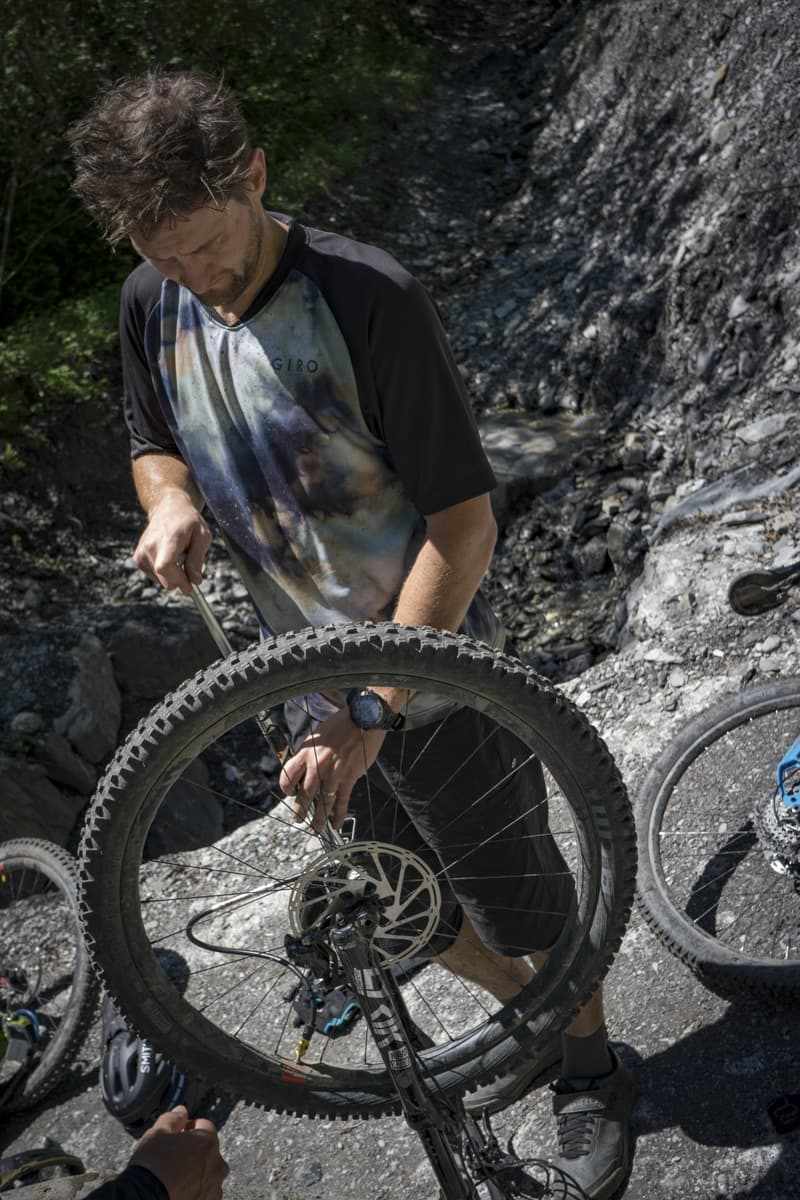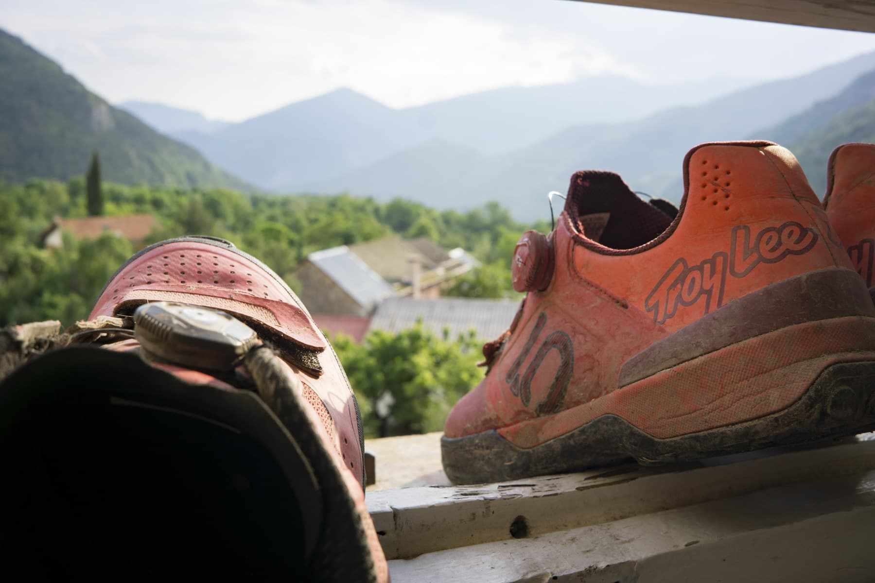 I stand at the bottom of a trail. Despite the beauty of the wider country that surrounds me – I started the day descending a frost-covered col, alpenglow hitting high peaks, a perfect ribbon of trail steering us through chilly air into the wooded valleys below – my spot isn’t exactly picturesque. Scrappy tarmac and a concrete culvert. Scrubs of foliage provide me with a little shade, but as midday approaches I can already feel the sun intensifying on my neck. And yet, there I stand still. Rooted to the spot. I strain to listen for the telltale rumble of tyres on loose rock… hollow chunder, scraping of a locked wheel through an ancient trail, the odd squeal of hot brakes, and whoops and hollers from the most vocal of riders. It’s impossible to relax fully, but I grab bites of a not hugely inspiring peanut butter and Nutella sandwich before returning to the task at hand – the small timing box dangling from my wrist while I busy myself doing not very much. And there I stand: one small part of a much bigger thing, ears pricking up as sound tumbles down the hillside heralding the first rider as they appear through the foliage.
