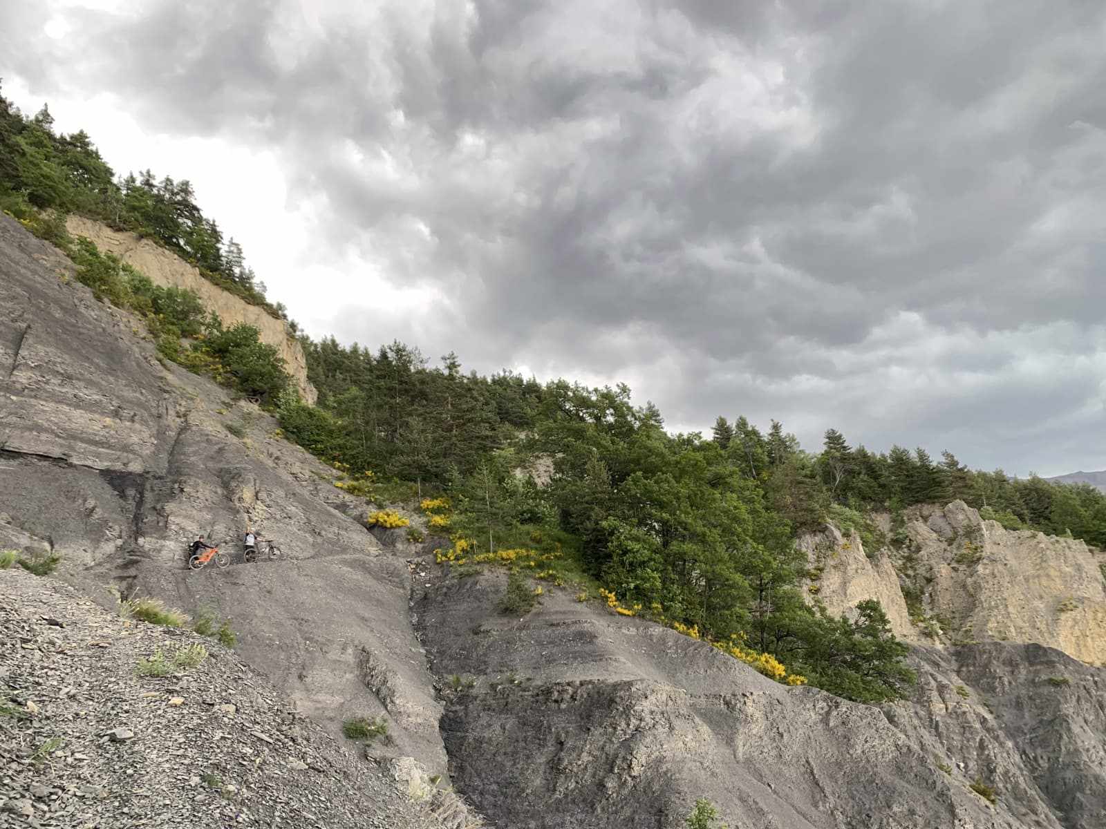 The afternoon is stretching into early evening and we are sweeping the trail. Timing duties done for the day, we follow the last riders as they make their way higher and higher above the Grey Earth near Valberg. Threatening clouds loom above us, as dark as the shale rock that we are hikeabiking up. Huge cumulonimbus, mustard tinged, bristling. We have been hunted by the echoes of thunder all afternoon, and finally the storm is catching us up. Fat raindrops stain the ground, we pull waterproofs on just as spots become downpour, fabric dragging against sweat-covered bare arms. Marble-sized hail pelts us as we get to the top of the penultimate stage – the tail markers having already disappeared down, fleeing the weather.