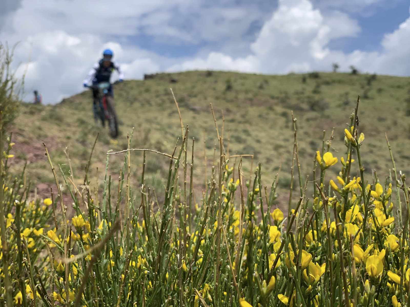 The storm might have passed, but we thunder down the final trail of the day. Chalky white bedrock, deep and dusty hairpin turns. ‘Feel Good Hit of the Summer’ by Queens of the Stone Age plays on loop in my head. “Nicotine, Valium, Vicodin, marijuana, ecstasy and alcohol… c-c-cocaine” as clouds of white dust explode in each corner. I squint through the non-narcotic powder thrown up by the rider in front. “Nicotine, Valium, Vicodin”… STOP. Sign. Tape. “Nicotine, Valium… c-c-cocaaaiiinnee.” I feel intoxicated by the whole experience, living a few turns as a hero. Drifting, surfing, playing – aware that this is work and there is still a long way to go. Backing off for a turn or two, then opening the taps because it is too damn good not to.