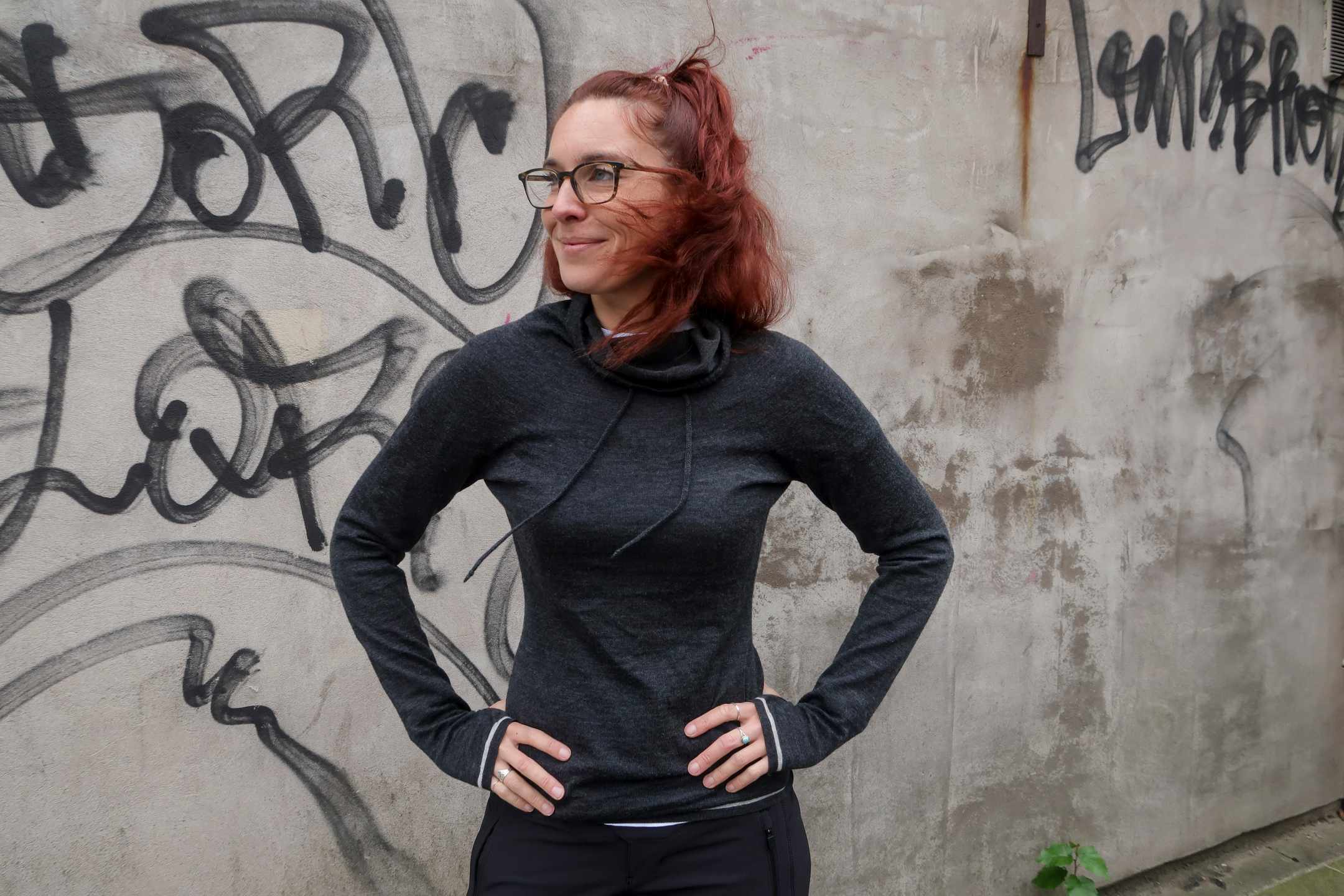 The cowl neck is really long with a drawstring, so in general it’s just gathered up keeping you warm but if you want to pull it up over your nose on an icy cold descent you can – it’s like a built-in buff.