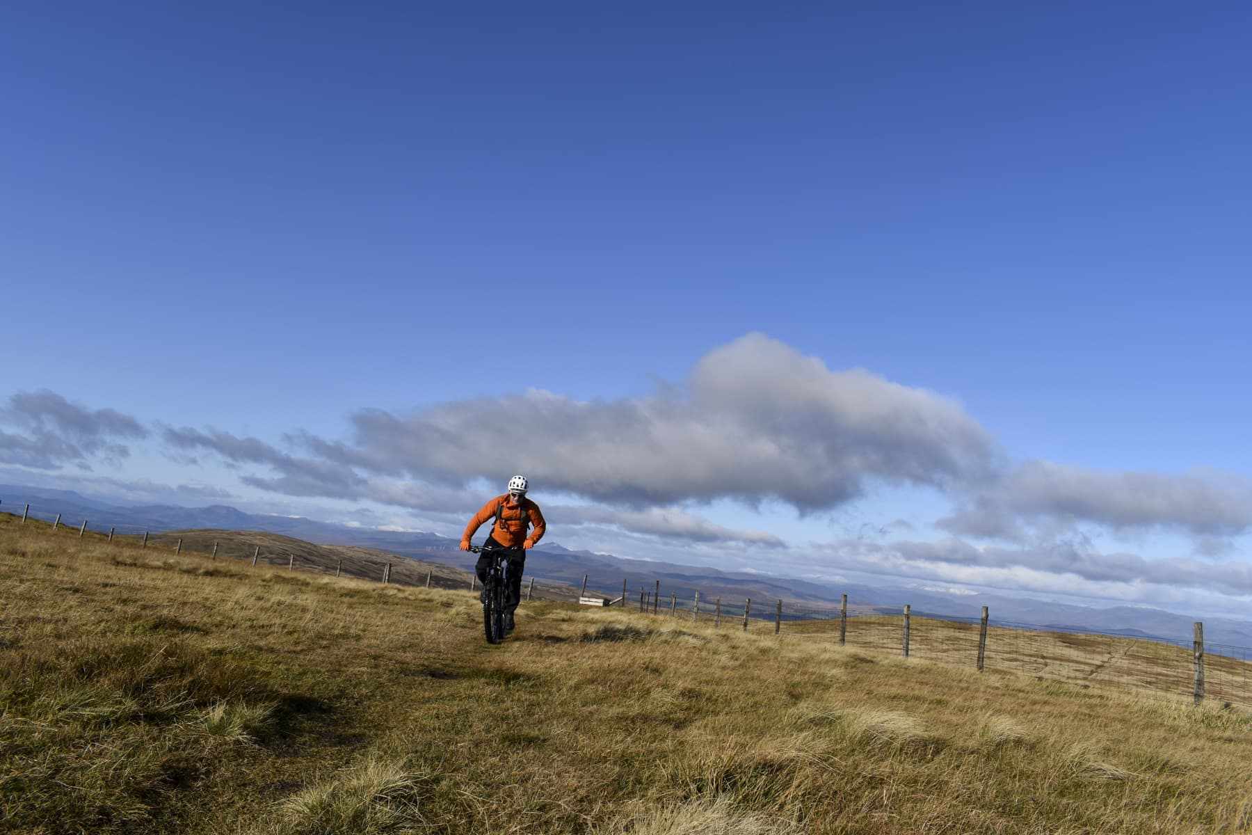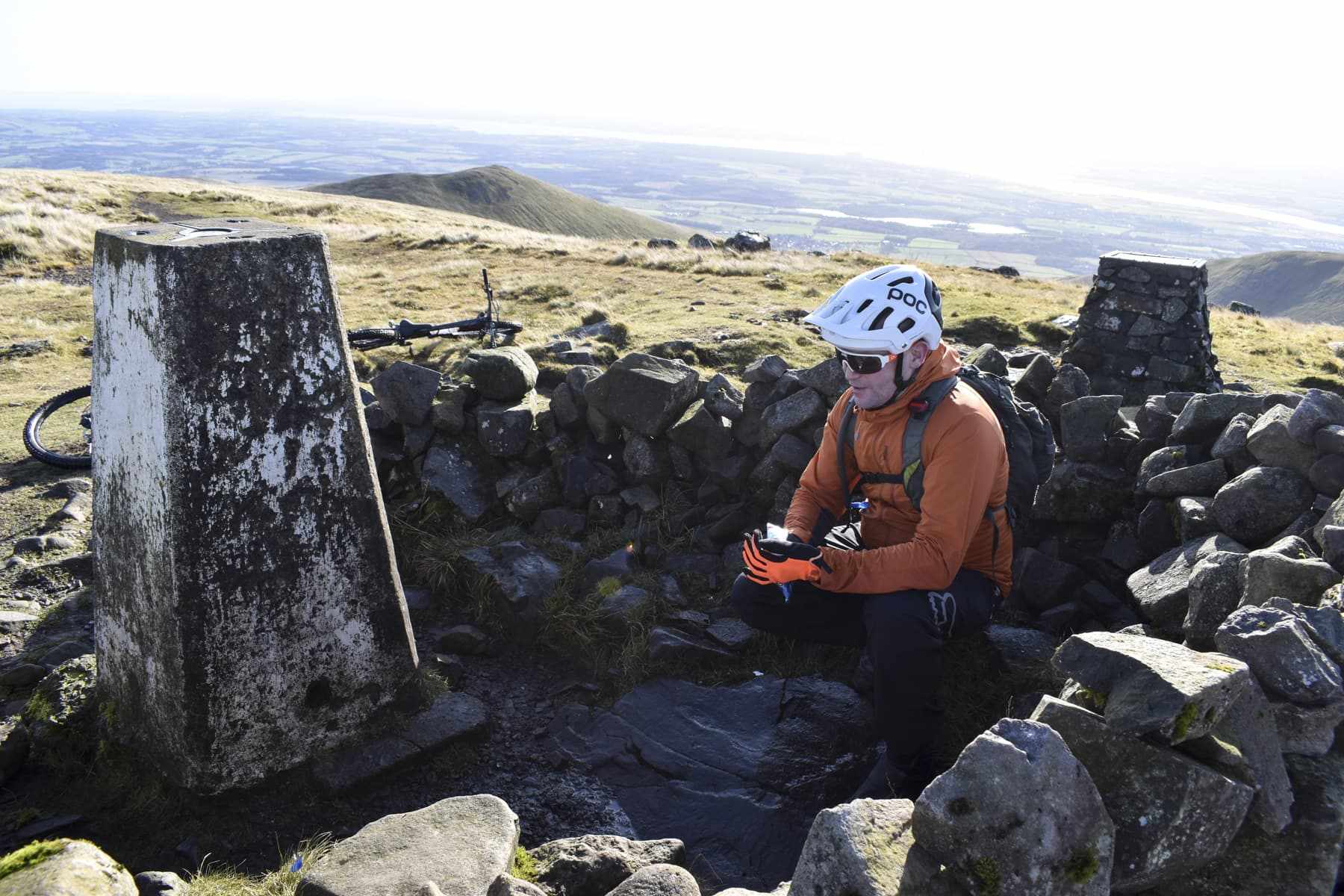 Devoid of trees, the glen has a bleak and stark beauty to it. Having been up here previously in a whiteout I know how grim it can be, but on this day we were given the full tourist treatment. Hitting the saddle, we turned east to follow a well-trodden, albeit in parts boggy trail, that would take us to the summit of Ben Cleuch, the high point of the range at 720m. To our delight, the teeth-cracking headwind was now a full on tailwind. The trail to the summit can be a bit of a challenge – if you want to clean it, bring your low gears and your climbing legs. Leading the way, I passed a jolly walker coming off the hill. Only later did I learn that as he passed Brian pushing, he laughingly suggested that I was perhaps a bit of a nutter for riding up.