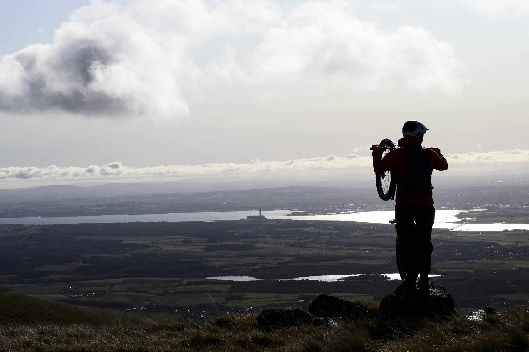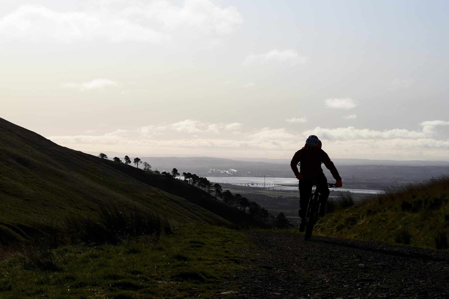 Heading out from Ben HQ, he quickly displayed his local knowledge honed over many years by getting us just a teensy bit lost. I laughed as Ben confessed that most of his riding in the last ten years had been done in the wilds of Scotland and the Alps and he rarely rode his bike up here. However, covering a fairly compact geographical area, it took us no time to get our bearings as we mooched through the woods and up in to a now defunct quarry. A favourite of local riders, the old spoil heaps make for an amusing winch and drop play session. Having bigger fish to fry, through a mixture of experience, guesswork and good fortune, we soon found ourselves on an old fire road that took us directly to the summit of Lewis Hill, an open clifftop that offers expansive views over to the Ochil and Touch Hills and far beyond.