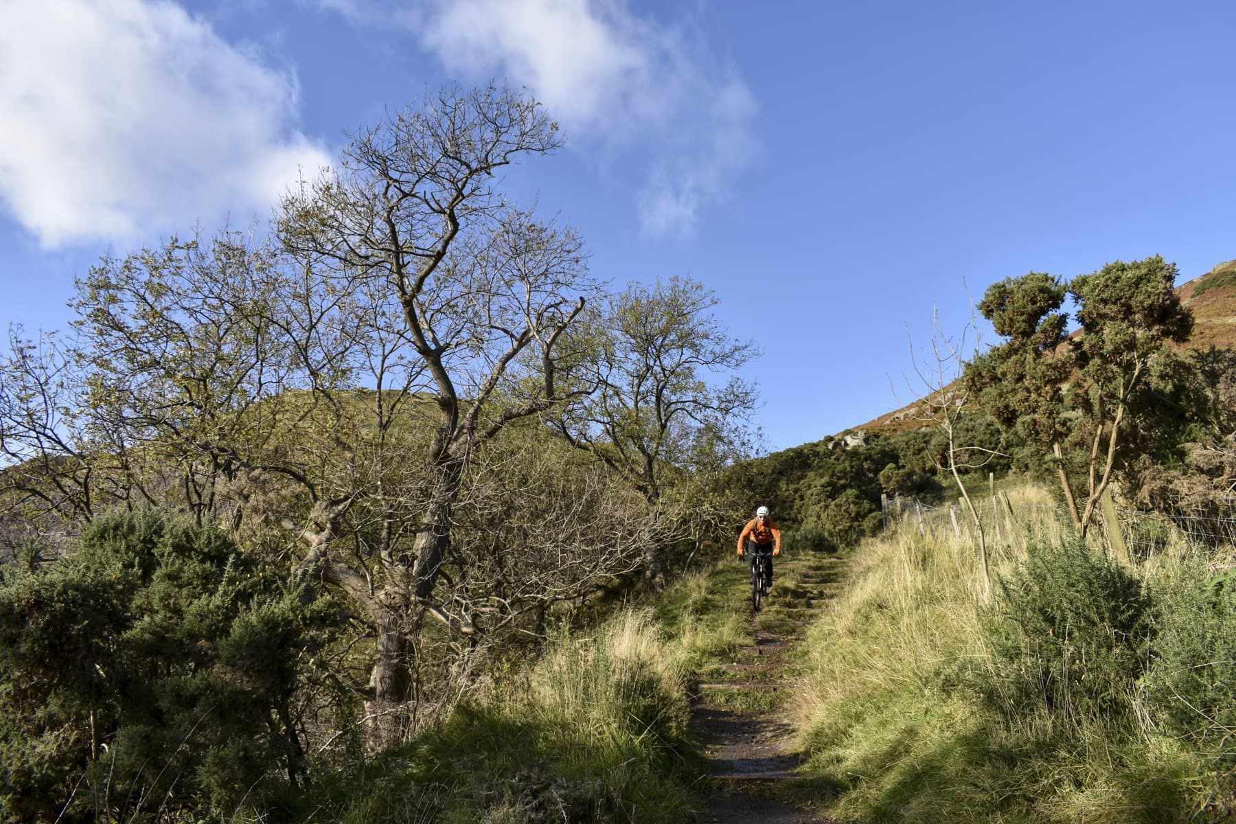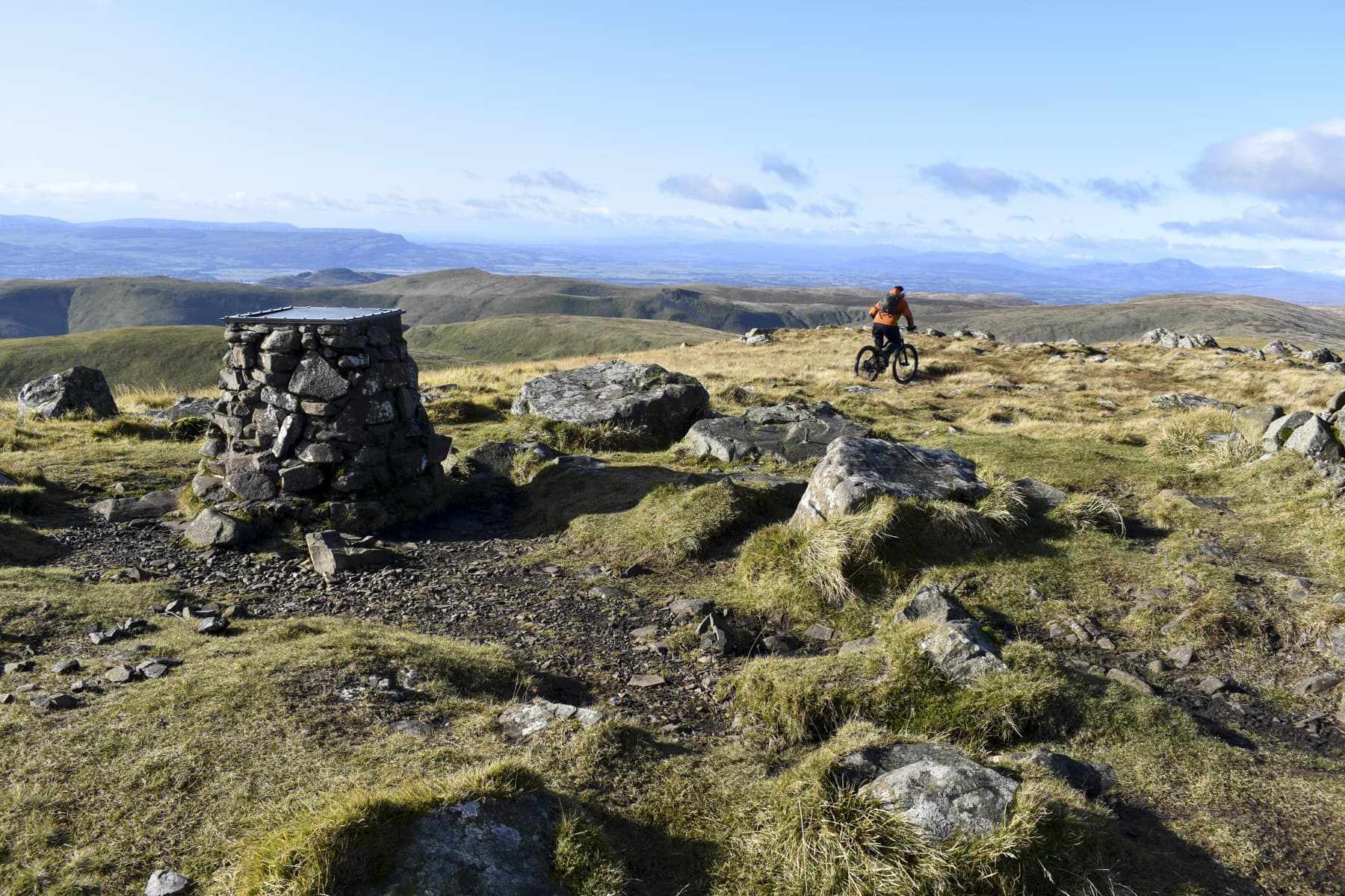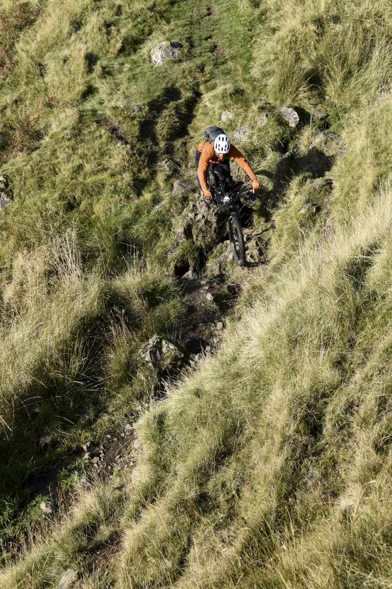 A barely discernible rut of a micro-track wends its way through the grass and heather, rarely revealing more than a few feet of itself at a time. Concentration and careful pedal placement are required lest one wants to be pitched off down the hillside in ignominious manner. Looking ahead and up the trail doesn’t work; you simply cannot see that far ahead – rather it is more akin to riding by feel and instinct alone. Those expecting easy flow should look elsewhere. However, stick with it and the rewards come. Slowly, almost inexorably at first, the trail becomes more defined and the riding easier. Speed picks up as the slope steepens and the hillside track becomes more open. Glacial moraines, an old gatepost, banks of fern – all whizz by in the blink of an eye. A rocky chute over a burn appears, the smooth track becomes interspersed with boulders waiting for you to take your eye off them for just a second, the sides steepen and suddenly you find yourself in a rocky channel of stepdowns and bedrock. It is nothing if not varied. You stop for a breather. Looking up, the villages and towns of the valley appear to have suddenly popped up in front of you with no warning whatsoever. ‘Were we not just on the summit a few minutes ago?’ you muse to yourself. Not one to finish with a whimper but a bang, a series of flowing switchbacks beckons you ever downward before finishing with a series of wooden steps built into the trail. Fast or slow, you chose, both work. And then it is done. Spat out onto a minor road you are back in civilisation, your ride over. And what better place to finish than at the old drovers’ pub that is The Woolpack, which just happens to be right in front of you when you finally look up? An open fire, real ale on tap, job done.