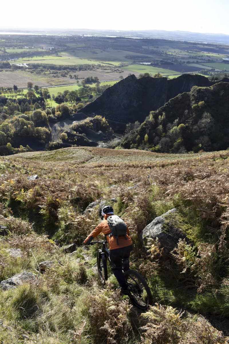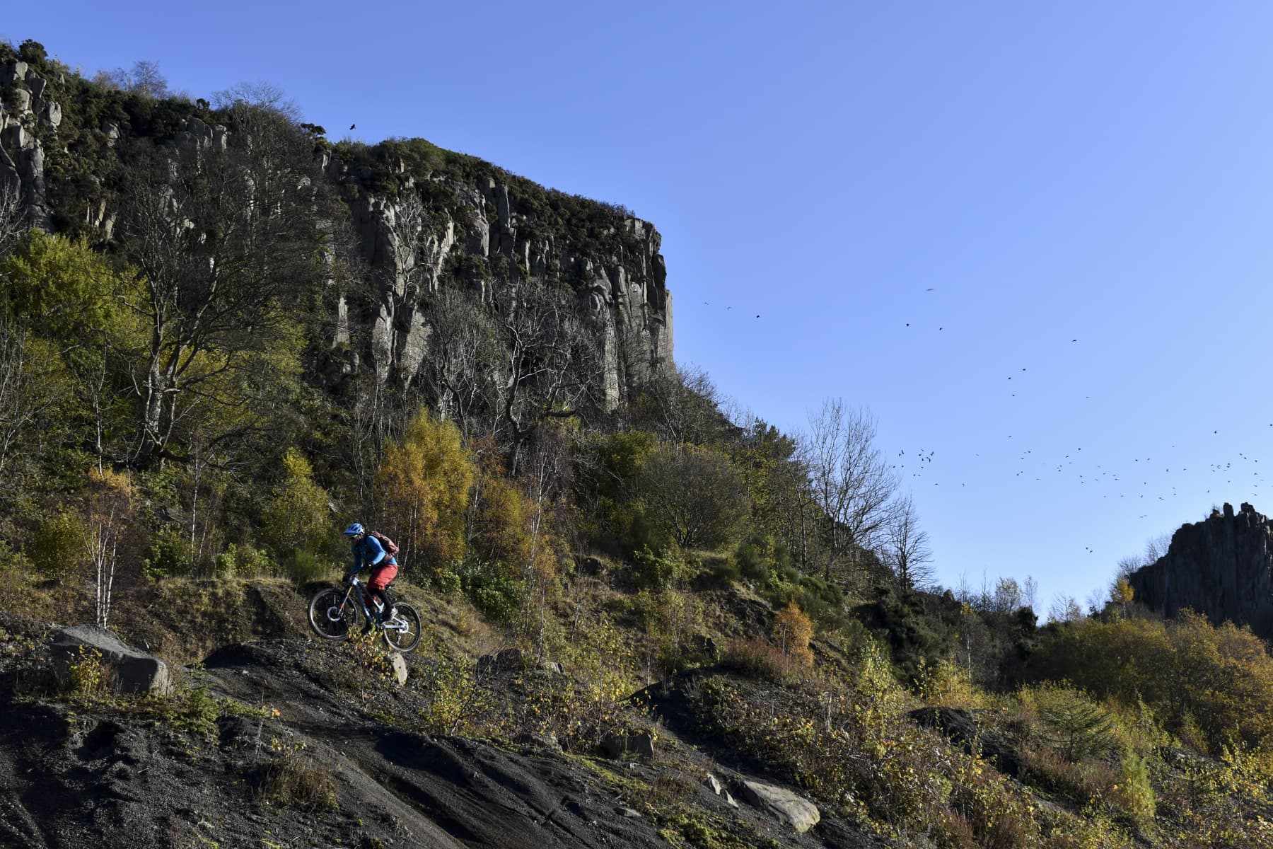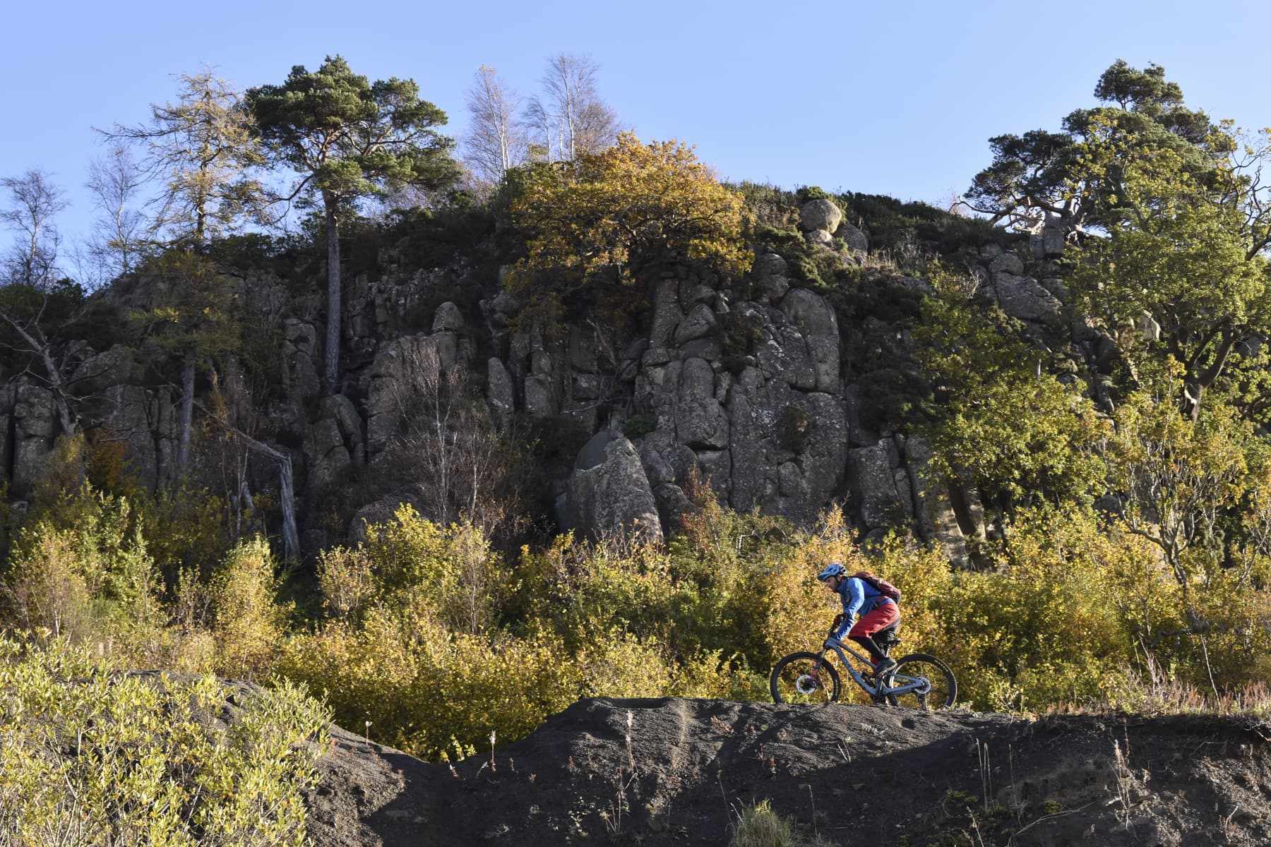 A dry, hard-packed trail snakes its way along the top of the cliff. Rocky drops and short, sharp rises punctuate the trail as you ride through the heather-laden landscape. To your left, what you think are bushes are actually the tops of large conifer trees soaring up from the base of the cliffs far below. You want to take in the scenery but the trail is just too damn fun to want to stop. After heather comes a copse of birch and ash, an enveloping blanket of ferns long past their summer pomp at their base. Out of the saddle, you are sprinting when suddenly the trail darts right and you are faced with a steep, rocky chute with wheel-swallowing rock steps. Ride or walk, you decide, both are fine. After the drop comes the steep winch back up through the trees. It’s a right old lung buster, make no mistake. Sun dapples through ancient woodland. Your mind wanders. Who knew that there were quite so many shades of brown, gold and green? Fans of Farrow & Ball would be having a hipster-fuelled paint-gasm at this point.