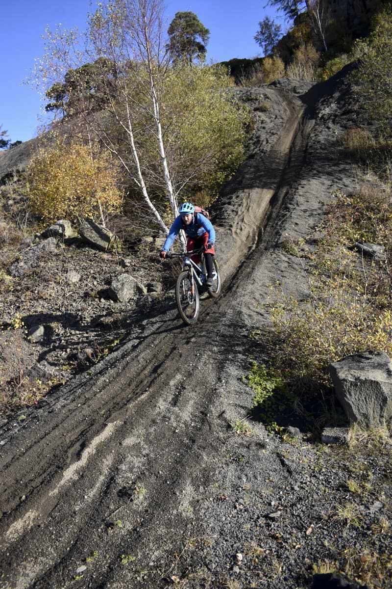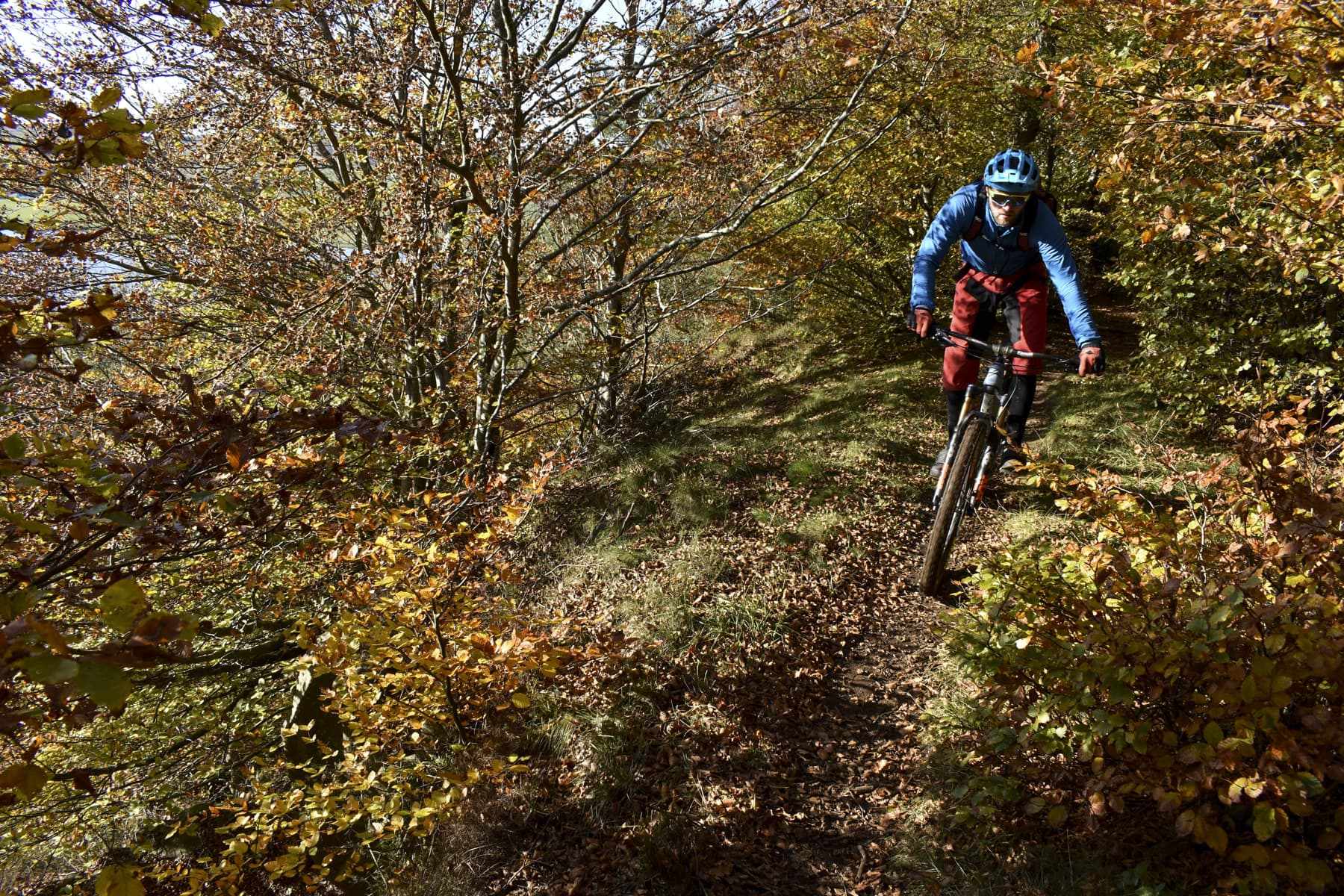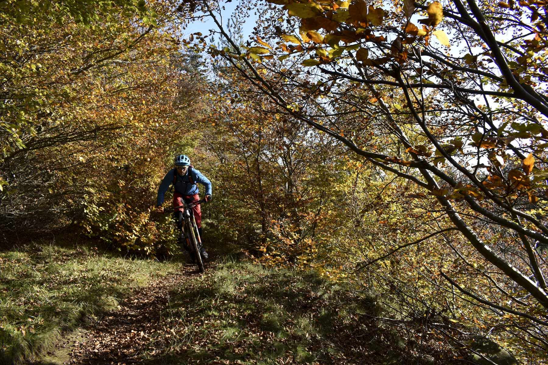 A dry, hard-packed trail snakes its way along the top of the cliff. Rocky drops and short, sharp rises punctuate the trail as you ride through the heather-laden landscape. To your left, what you think are bushes are actually the tops of large conifer trees soaring up from the base of the cliffs far below. You want to take in the scenery but the trail is just too damn fun to want to stop. After heather comes a copse of birch and ash, an enveloping blanket of ferns long past their summer pomp at their base. Out of the saddle, you are sprinting when suddenly the trail darts right and you are faced with a steep, rocky chute with wheel-swallowing rock steps. Ride or walk, you decide, both are fine. After the drop comes the steep winch back up through the trees. It’s a right old lung buster, make no mistake. Sun dapples through ancient woodland. Your mind wanders. Who knew that there were quite so many shades of brown, gold and green? Fans of Farrow & Ball would be having a hipster-fuelled paint-gasm at this point.