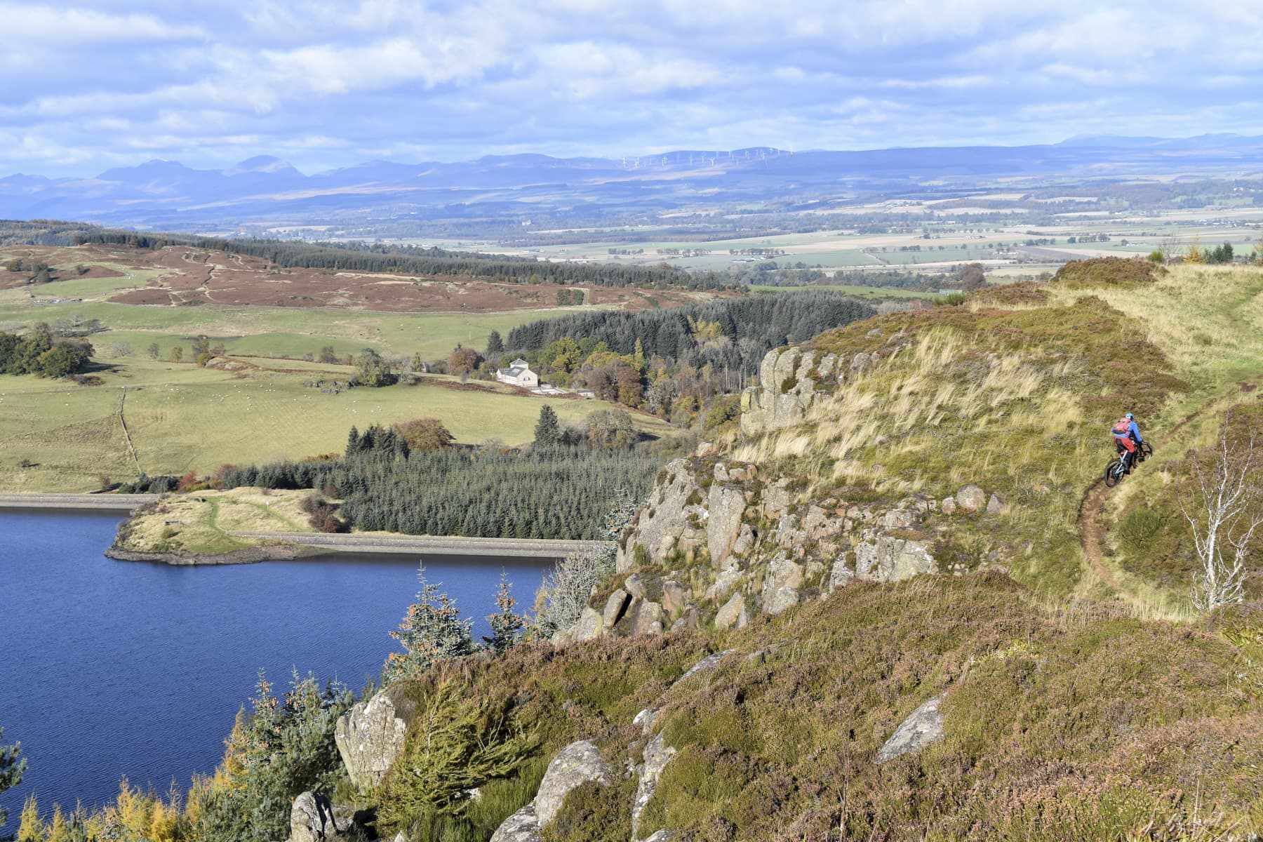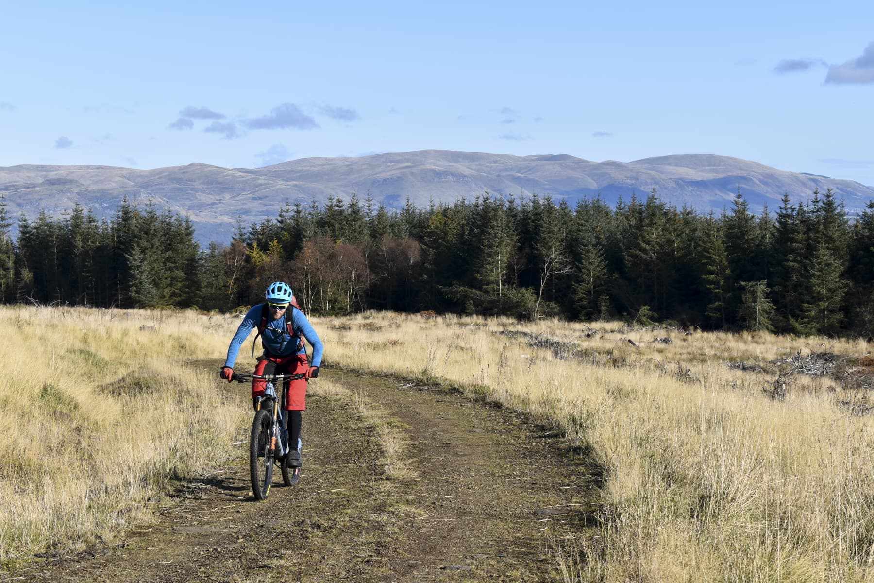 Now things are getting a bit more consequential. Scots Pine and other types of conifers to your right, the trail hugs the very edge of the cliff. A rogue pedal strike or a misplaced wheel could have very big consequences. If you are going to fall, make sure you fall right. Look up, focus and flow. Another rocky chute, a brief section of portage and the third and final cliff beckons. What was once dense woodland is now an area of clear fell. The direction of travel is down, but the cliffs aren’t finished just yet. Roots and rocks abound as you throw your bike tyre edge to tyre edge, darting down prime Scottish trail. If you like going fast, make sure you bring your A game. If you like taking things a bit mellower, that works just fine too. You are losing height but an off could still be pretty serious. And then you are done, back on the fire road where you started. Time for a second lap perhaps?