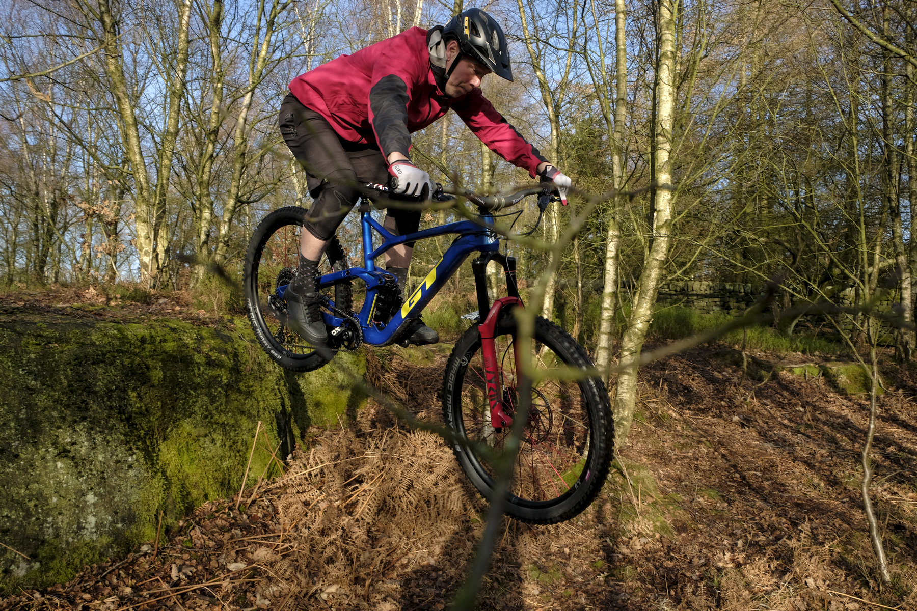 Our Monday-morning photo shoot in the woods is literally the first time Chris has ridden his new team bike, a full suspension GT Force. He’d spent his Sunday building it up from a large box of bits, before settling down to watch the snooker with a bottle of wine.