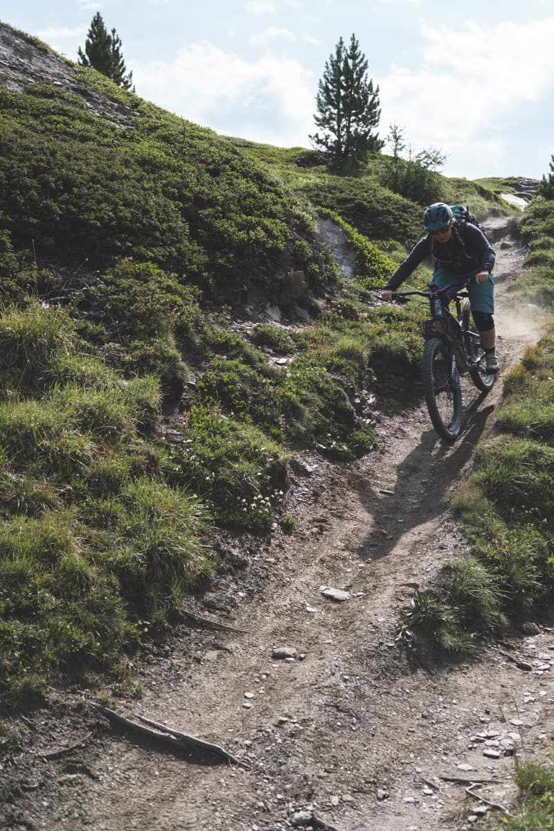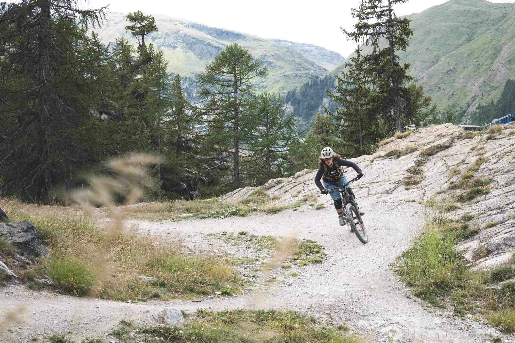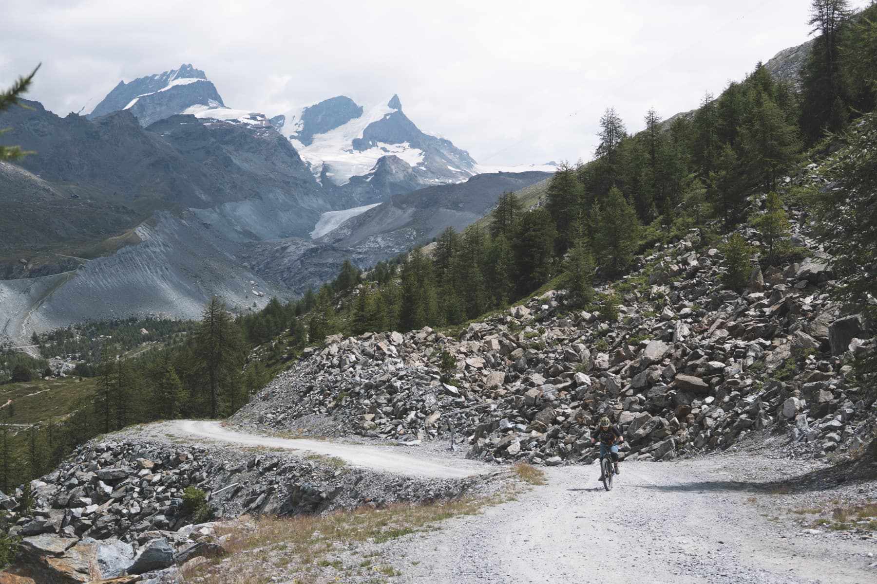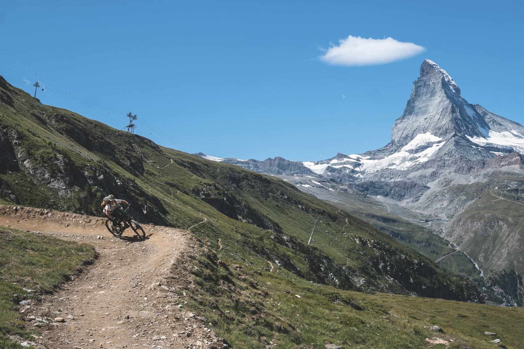 After fighting to get off the platform through over-excited tourists and one emergency pee later, we were on the bikes and heading down a fire road. It’s worth noting this kind of fire road isn’t the same compact, trimmed stuff you find in the UK. Picture a landslide of razor-sharp shale, combined with a harsh sprinkling of boulders the size of The Hulk’s left foot. It’s desert-level dry, feels like it hasn’t rained since the Matterhorn first sprouted, and we’re slipping and sliding down a trail shared with a double-decker coach-load of folk, who grind to a halt with a moment’s notice to claim their obligatory picture with the Matterhorn. We’re quickly led off the fire road and onto a much more familiar berm-filled, loamy section. It was at this point that Emma wet her pants. A marmot poked its head out of its hole, gave its little marmot scream and disappeared back into its muddy home. Emma has this thing about marmots – if she were given the choice between meeting Trump to ruffle his ‘hair’ and meeting a marmot, Trump would prevail over the scary marmot. It’s weird; we’re working on it.